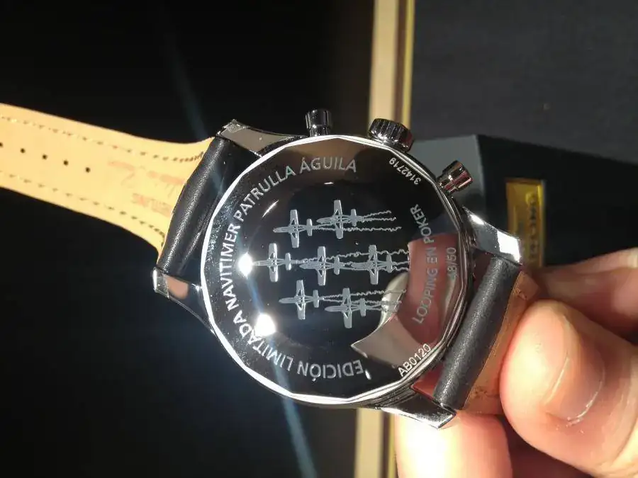 Esta nueva versión está inspirada en el Navitimer 01, reloj de culto y el cronógrafo más legendario de todos los tiempos. Su esfera inédita, negra con contadores negros y números árabes aplicados, contrasta con los colores rojo y plateado del avión utilizado por la patrulla en todas sus exhibiciones aéreas alrededor del mundo, el CASA C-101 , conocido popularmente como "Mirlo".