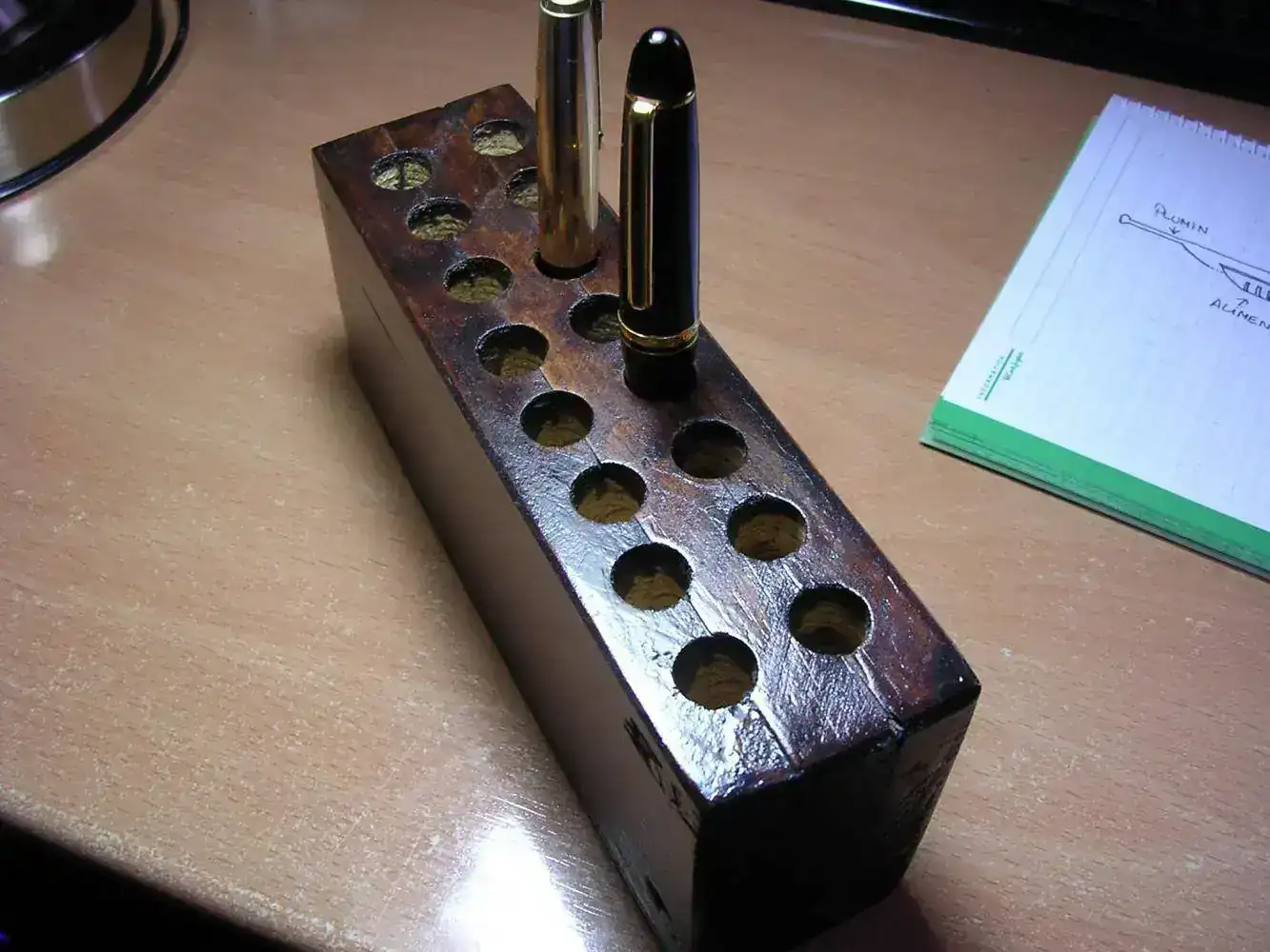 Hola, yo utilizo estos bloques de madera, que he taladrado con brocas y me sirve para colocar en vertical mis estilográficas, dificultad ninguna.