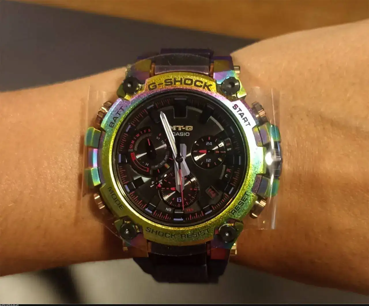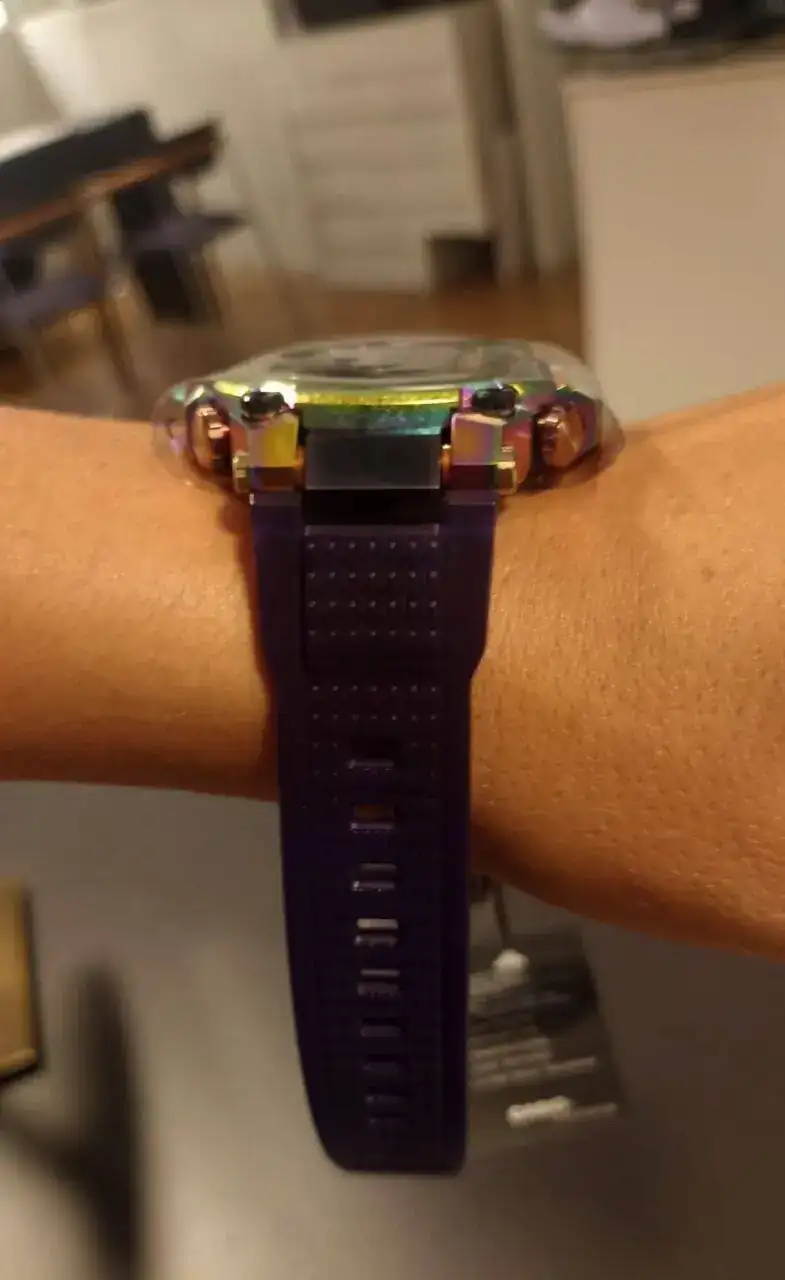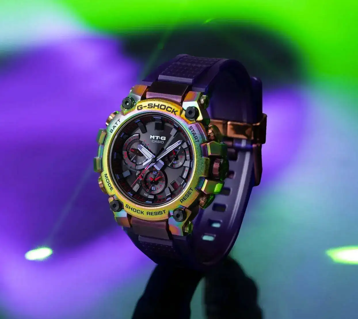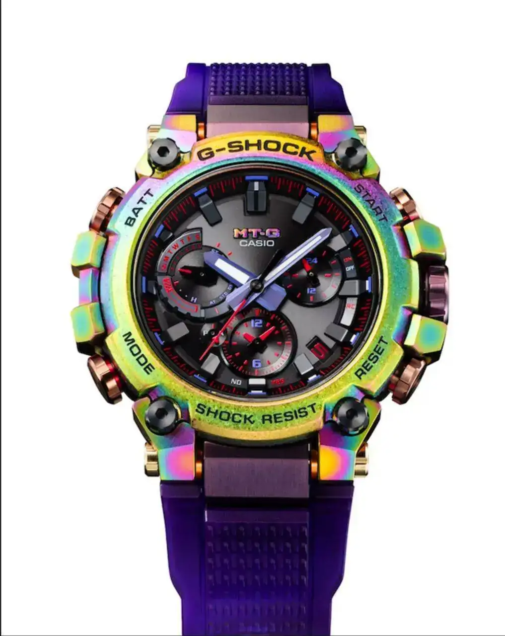 Diseño asombroso: el metal se une a la resina en un reloj MT-G muy especial, inspirado en la aurora boreal. El acabado elaborado lleva este reloj a otro nivel: el bisel de acero inoxidable se trata primero con procesos de recristalización y endurecimiento de la capa profunda y luego se le aplica un revestimiento iónico de color arcoíris para lograr un diseño superior. Los colores de la aurora boreal también se reflejan en el nuevo tono morado de la correa de resina translúcida, combinada con la presilla de la correa en rosa dorado y la hebilla en morado; ambas con revestimiento iónico. Cada reloj es único, gracias a los detalles en los granos cristalinos*1 y el revestimiento iónico multicolor*2. La parte posterior de la carcasa, en acero inoxidable tratado con revestimiento iónico multicolor, se vuelve a pulir para eliminar la capa de revestimiento únicamente de las partes elevadas. El diseño del MTG-B3000 te encantará, recuerda a los colores de la aurora boreal vista desde el espacio exterior. *1 El acero inoxidable se procesa en componentes y luego se recristaliza, creando un diseño con detalles únicos en el grano cristalino y con sutiles diferencias en el patrón, el tono de color y el brillo entre una pieza y otra. *2 El aspecto multicolor del revestimiento iónico varia de un reloj a otro.Dimensiones (L × An × Al)