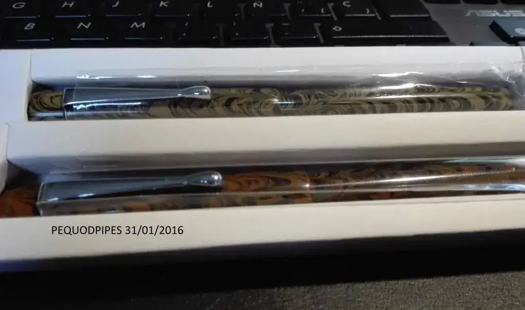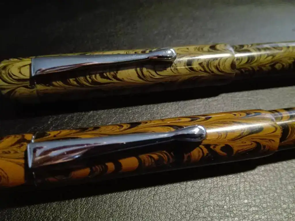 Son plumas de ebonita fabricadas por Click, establecidso en 1978, durante más de tres décadas sus productos han estado fijando continuamente el estándar más alto en calidad, estilo, gama y durabilidad. Son del modelo Full Ebonite Century Fountain Pen, su color es mezcla de marrón y negro con acabado marmoleado. Cada pluma esta hecha y pulida a mano. El alimentador y el plumín son ajustados y probados antes de salir a la venta. Las plumas son cuentagotas, tienen una enorme capacidad de tinta y escriben suave.