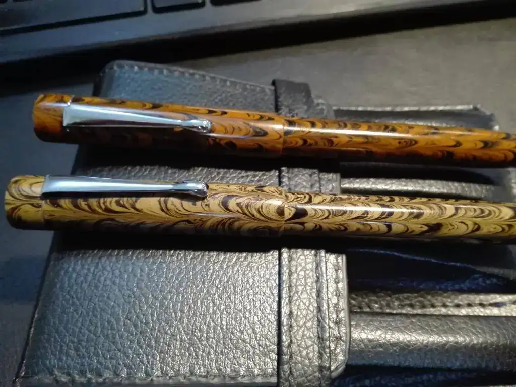 * Plumas estilográficas de ebonita marrón oscuro y marrón claro, con clip cromado.