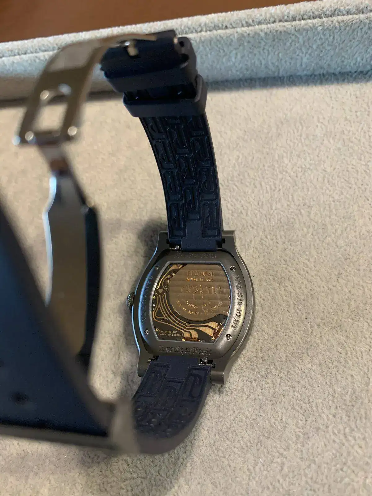 Conociendo, entonces esta fantástica trayectoria de F. P. Journe, no era sencillo el explicar que hubiese lanzado al mercado un simple reloj de cuarzo. Y claro, ahí estaba el error, que no era “simple”. Sobre todo cuando el propio Journe expresó que le había llevado ocho años de desarrollo. El mecanismo del reloj implica una parte claramente de estructura de pila con su correspondiente cuarzo, otra parte más tecnológica de un microprocesador y otra parte que es totalmente mecánica. La diferencia con otros cuarzos sobre todo es esa parte mecánica. Se trata de un detector de movimiento que lo han hecho visible en la esfera aproximadamente a las 4. Cuando este mecanismo observa que el reloj lleva 30 minutos sin moverse envía constancia de ello al microprocesador que en ningún momento deja parado su reloj interno pero ordena que el tren de rodaje y las agujas se detengan. De esa forma el ahorro de energía es enorme cuando no hay movimiento puesto que la energía que precisa el microprocesador para mantener su reloj interno activo es mínima. Se estima que la duración de la pila de este modelo debería extenderse hasta los 10 años en un uso regular pero incluso hasta más allá de los 18 años si ese uso no es constante (gente con más de un reloj suele haber muchos y sobre todo durante tantos años). Simplemente quitándose el reloj para dormir conseguiríamos añadir muchos años a la duración de la pila. Esto supone un ahorro en mantenimiento tremendo en comparación con cuarzos estándar con el cambio de pila y de juntas cada tres/cuatro/cinco años.