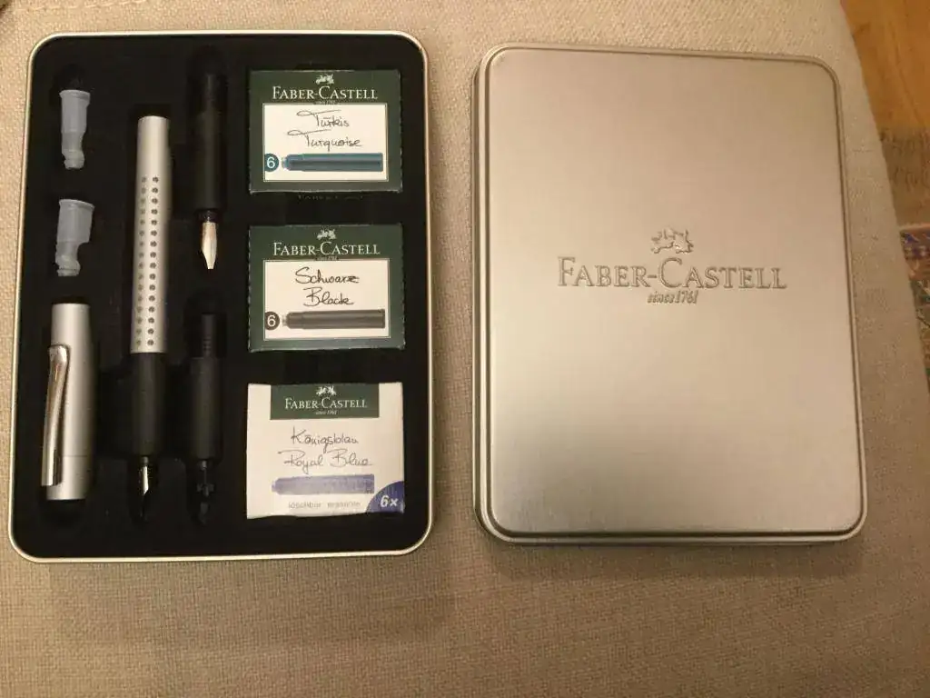 El juego de caligrafía es una pluma de las básicas, una Grip, con tres plumines: 1.1, 1.4 y 1.9. Son los típicos plumines de acero sin iridio, como suelen ser los caligráficos de acero. Trae tres boquillas, dos protectores para los plumines y tres juegos de cartuchos. El estuche es de metal, bonito.