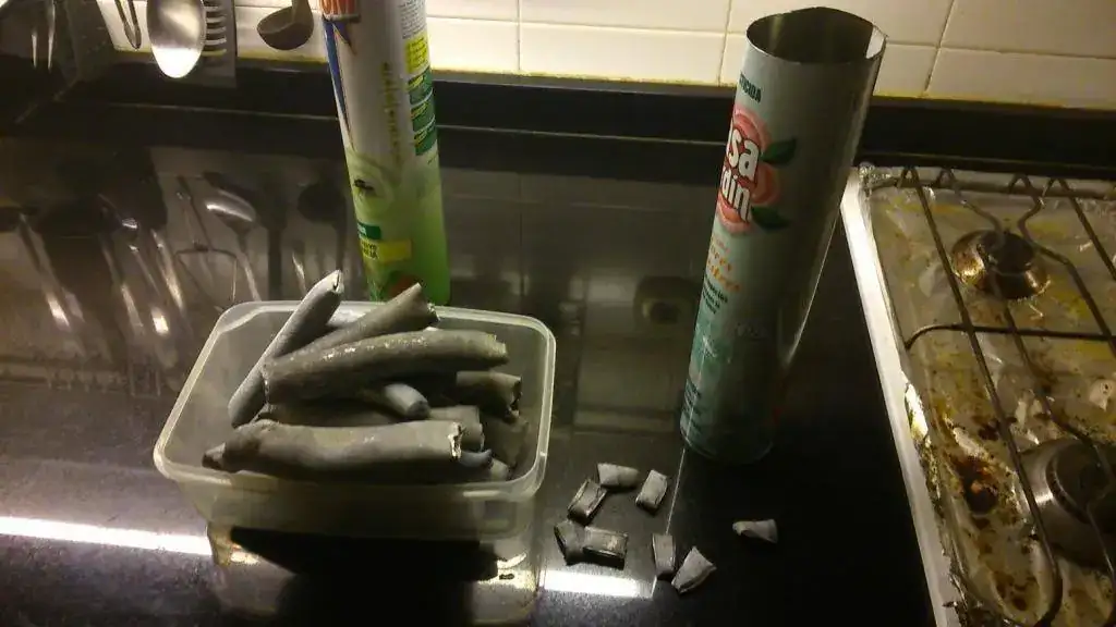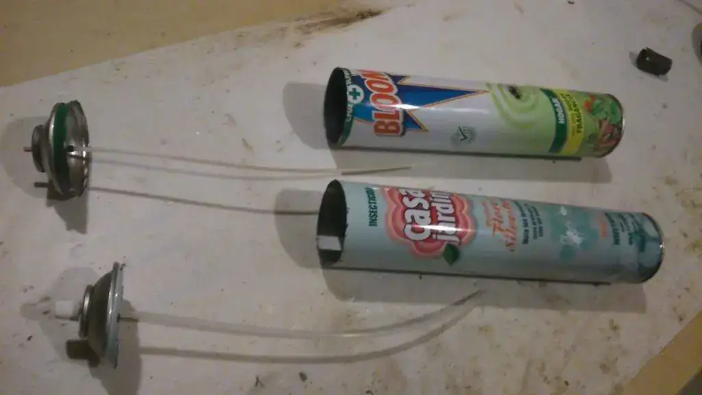 Se necesitan tres aerosoles de diámetro 65 mm. (en mi caso para un Morez). Se deben cortar las tapas del extremo, según la foto.