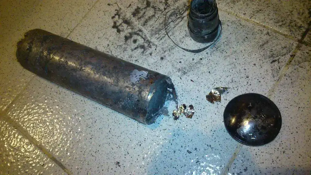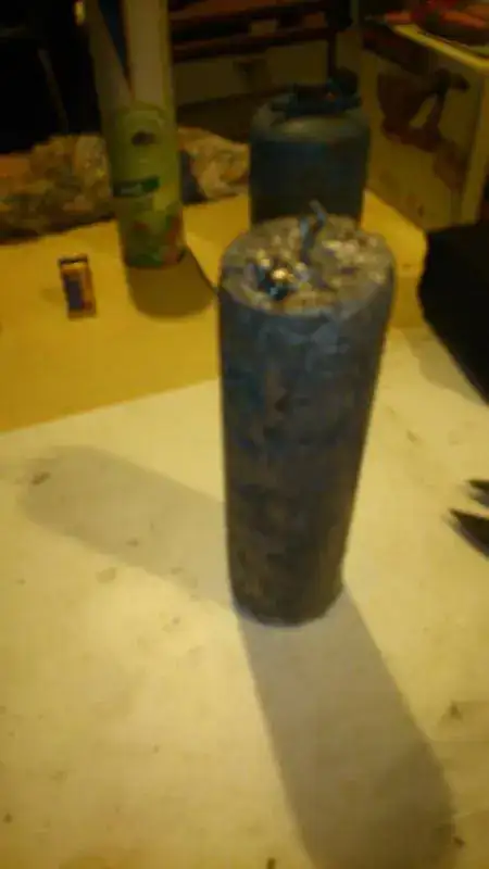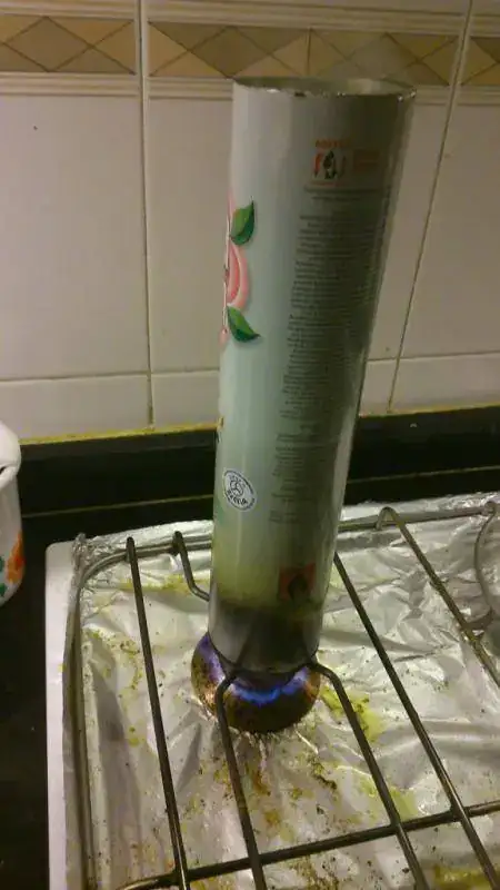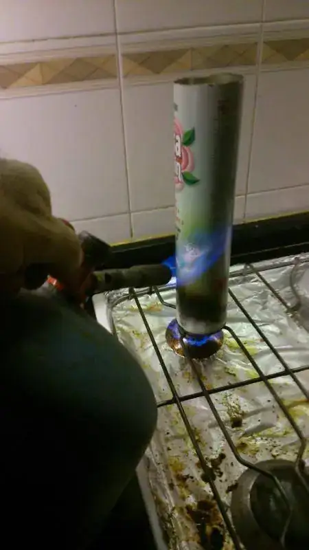 A continuación he recortado la tapa de un aerosol (vacío, claro está) de 65 mm. de diámetro y 300 mm de altura. Lo he puesto encima de un fogón de la cocina de gas y he ido tirando los trozos de tubo de plomo poco a poco, esperando que se fundieran uno a uno. He tenido que ayudarme de un soplete de gas azul, para generar más calor (el fuego de la cocina es insuficiente), situando la llama a media altura del nivel que alcanzaba el plomo al fundirse.