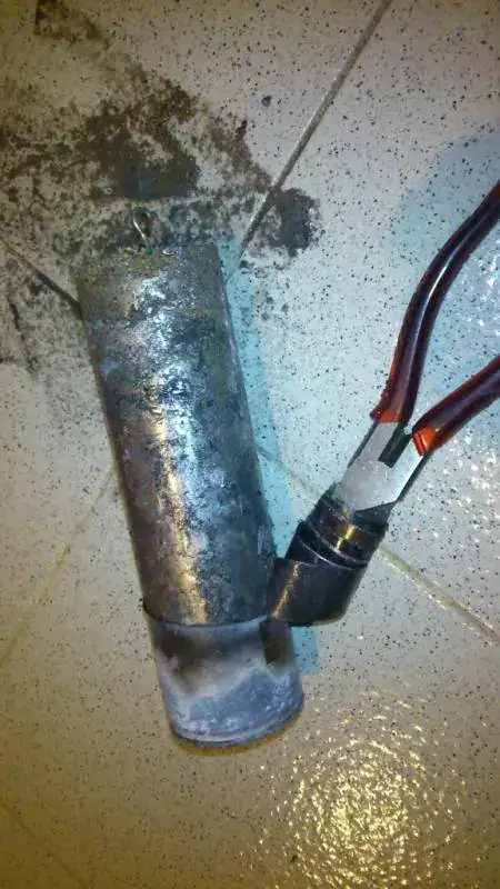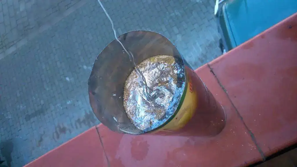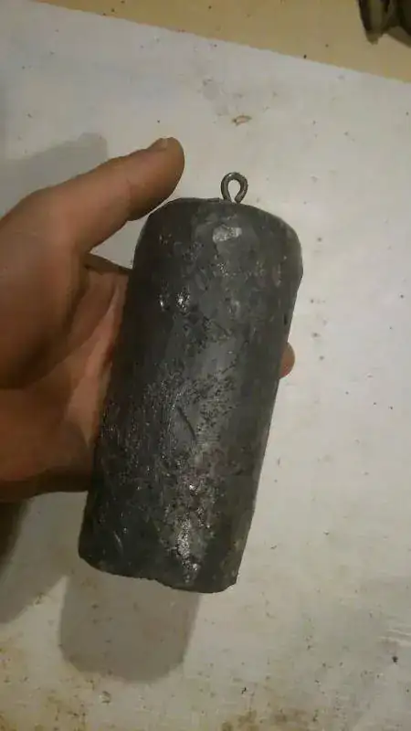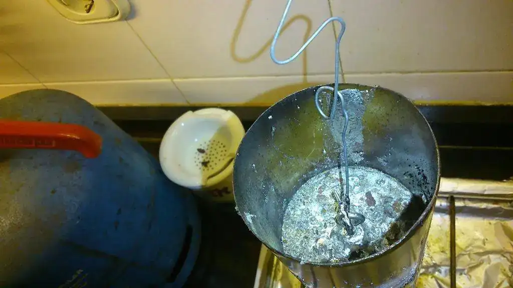Una vez esté todo el plomo necesario fundido (hay que pesarlo y cortarlo antes de comenzar el trabajo), con una cuchara sopera sacaremos la escoria que se produce debido a las impurezas y la propia oxidación del plomo. Cuando la superficie del plomo fundido esté brillante, introduciremos una varilla de acero de unos 15 cm. de largo con un extremo redondeado como un cáncamo para sujetar el gancho de la cuerda y el otro doblado a 90º para impedir que se escape de la pesa. Una vez situada la varilla, dejaremos enfriar el conjunto al aire libre, para no respirar los vapores de plomo.