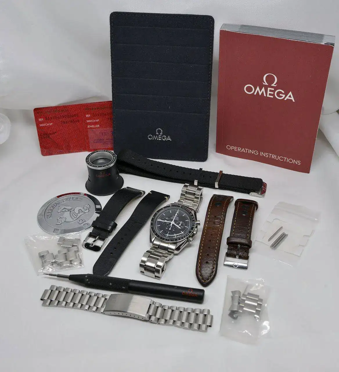 Además de su brazalete original con todos sus eslabones, se incluye en la venta otro armis president de la marca Uncle Seiko US1171 Bracelet (Omega Speedmaster 19/20mm) con un valor de unos 100€ y otras 2 correas de piel genuina de extraordinaria calidad y en un estado fantástico