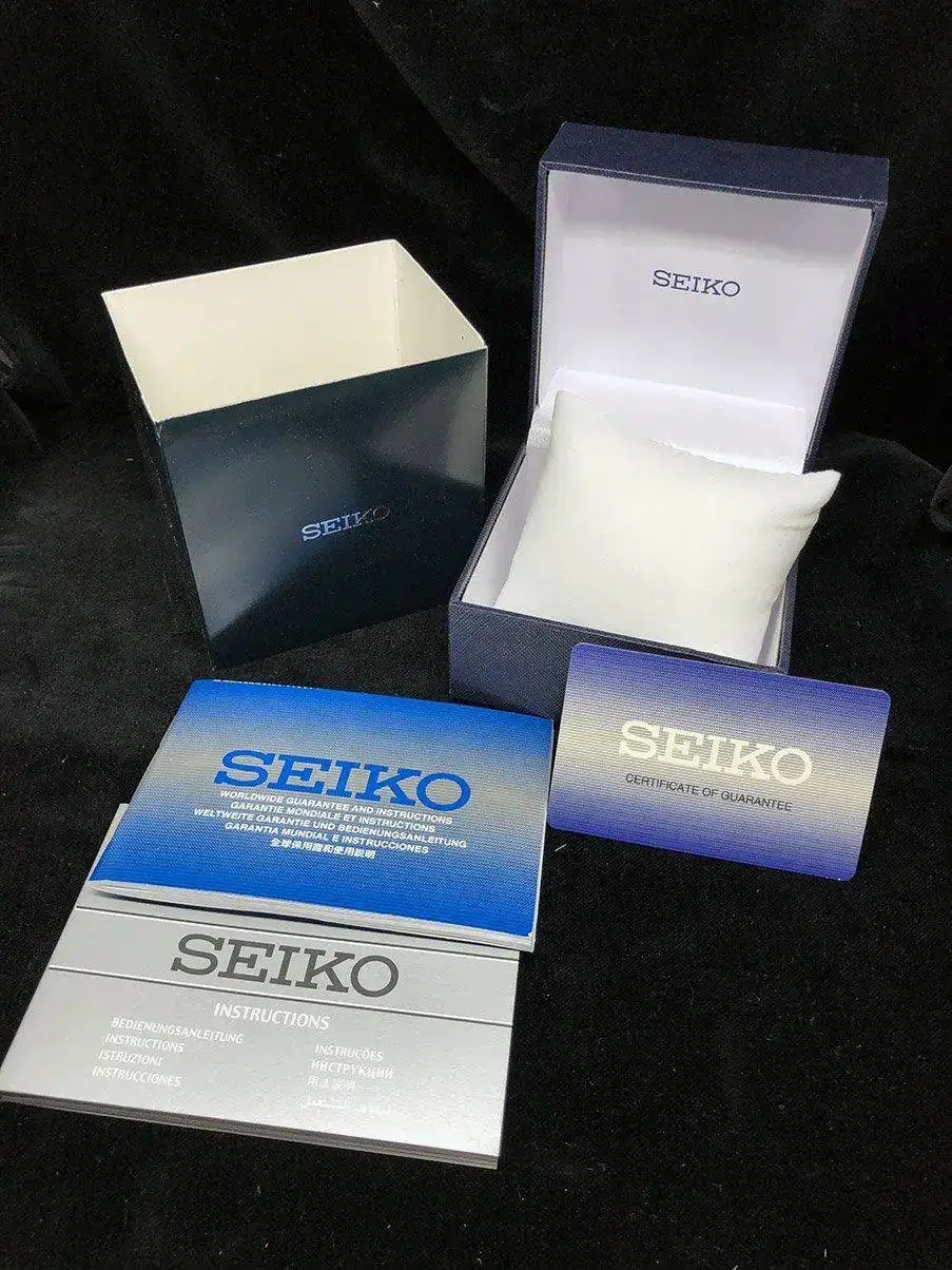 Caja Seiko original, manual y garantía profesional sellada, con 2 años de duración.