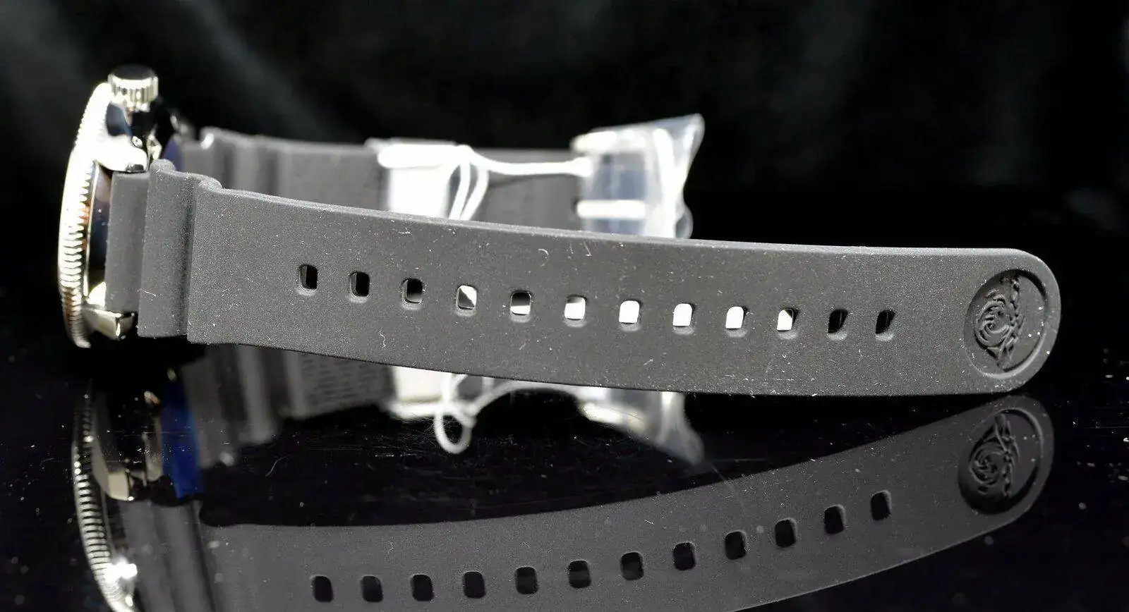 Correa de caucho negro con cierre de hebilla.