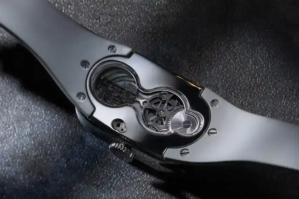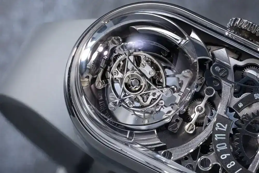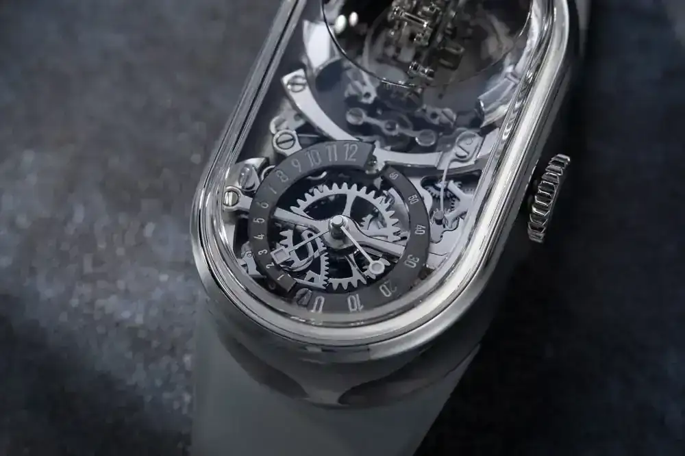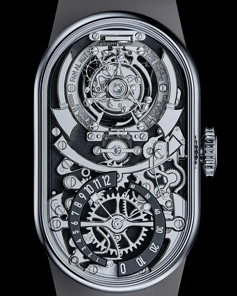 El tourbillon de doble eje con su jaula en forma de Möbius resulta fascinante, con cada eje operando a diferentes velocidades de 150 y 60 segundos. En la doble pantalla retrógrada de la esfera inferior, el segundero cuadrado se une a una manecilla de punta redondeada para la hora saltante, ofreciendo un atractivo visual. Con una disposición calada, el tourbillon y las indicaciones horarias evocan la complejidad del calibre M-01t de manufactura.