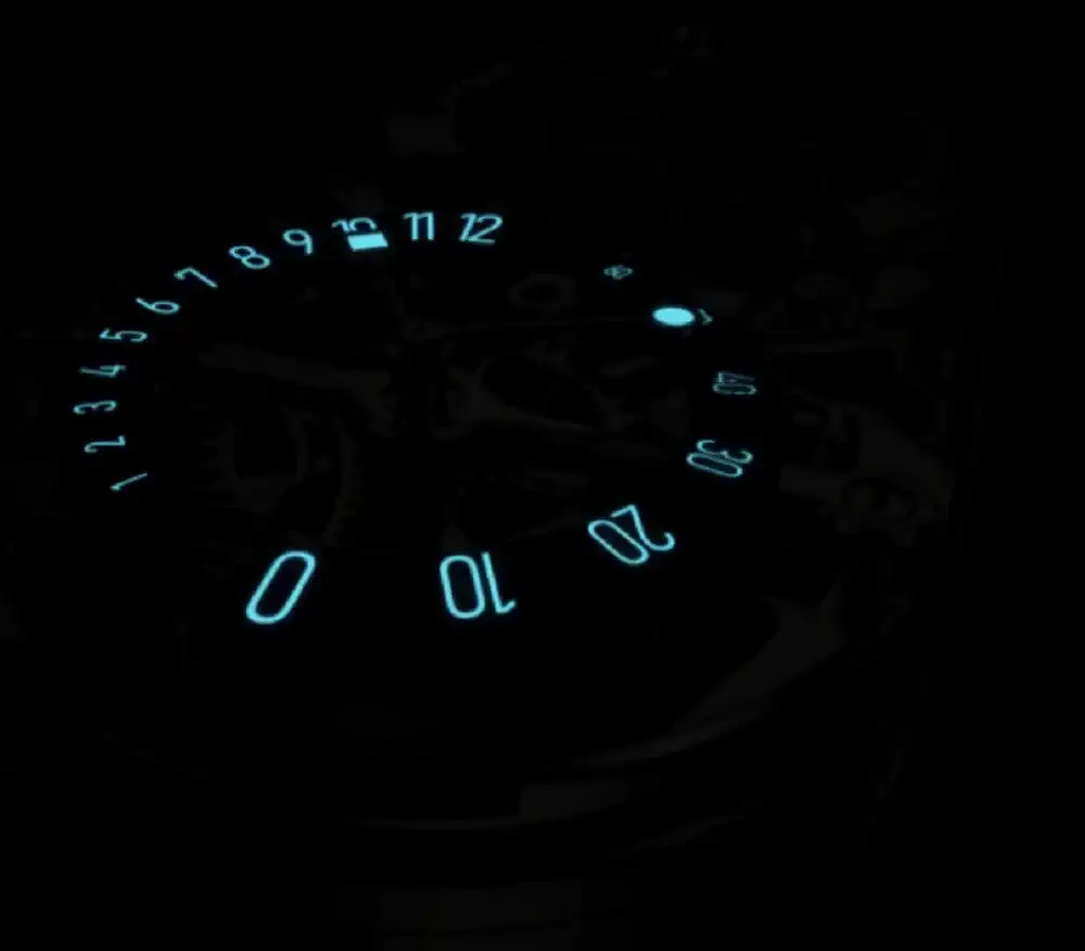 El acabado tanto de la caja como del movimiento del Mark 1 es excepcional, con más de 200 horas de artesanía dedicadas a cada pieza. No solo es evidente el detalle de la caja, con un pulido cóncavo a espejo, sino que el calibre de manufactura también luce un acabado artesanal excepcional. Con una frecuencia de 21.600 alt/h y una reserva de marcha de 50 horas, la vista lateral de la esfera del movimiento de cuerda manual se complementa con una vista a través del fondo de caja.