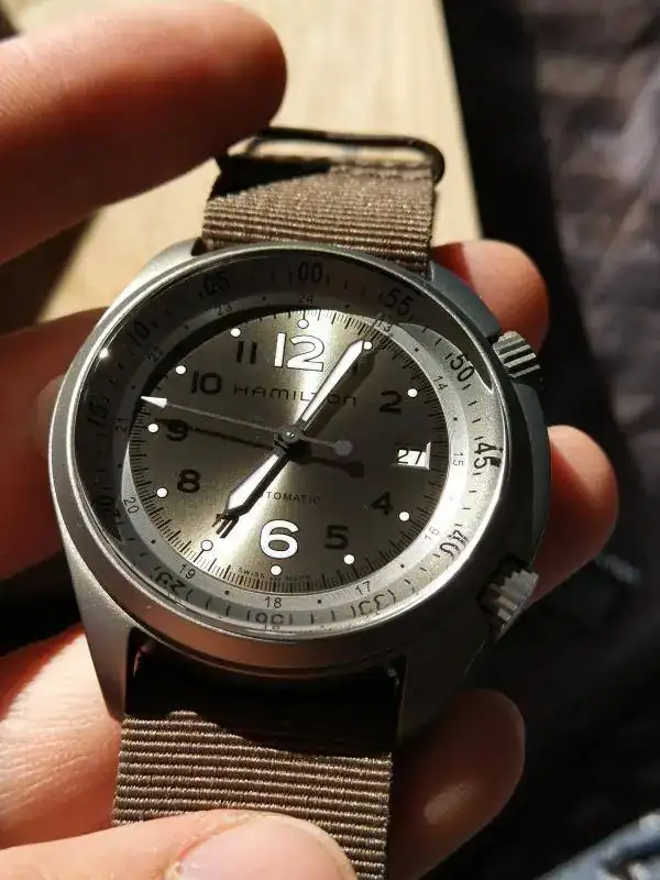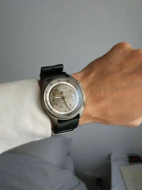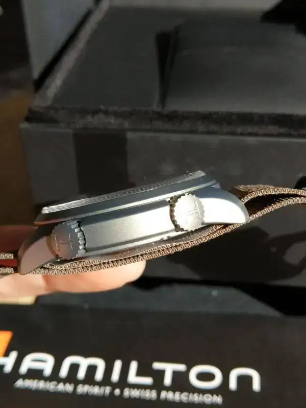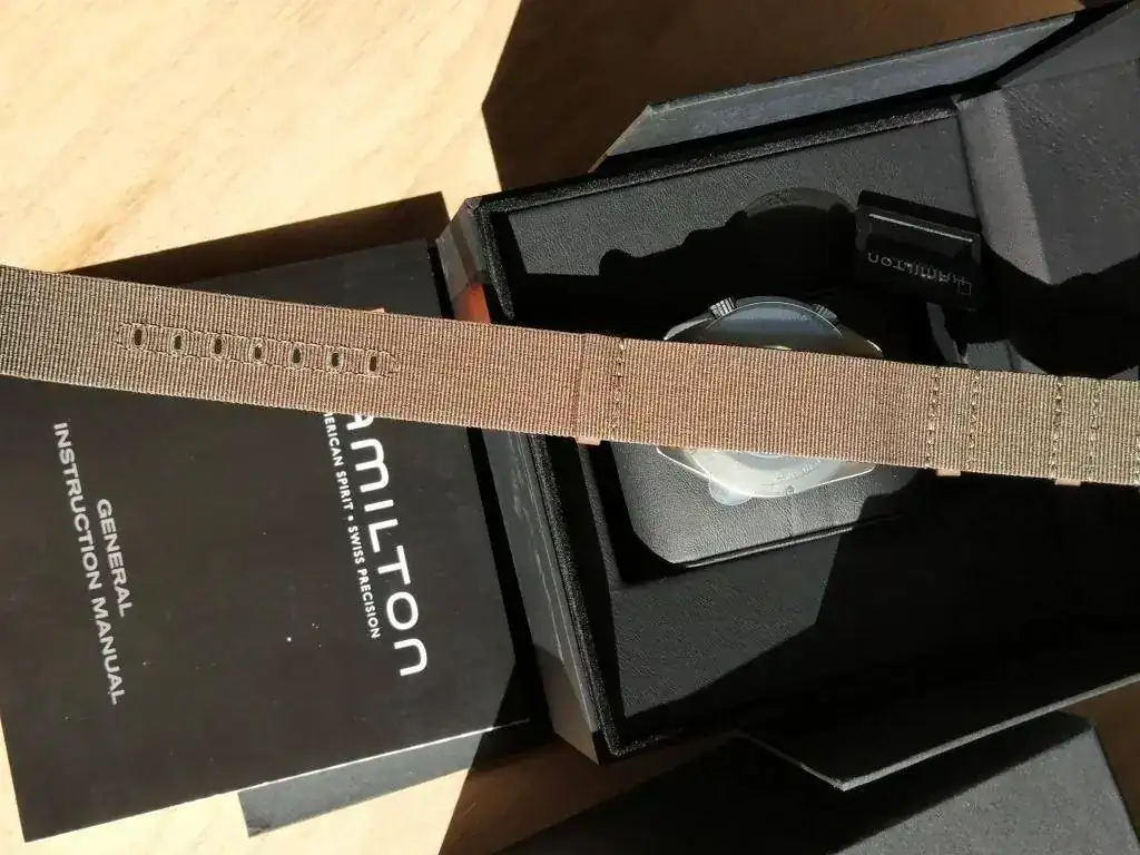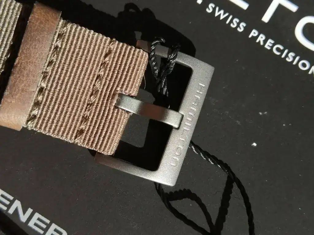 La correa nato también contribuye a la ligereza del conjunto. Siguiendo la línea militar vintage, la firma ha decidido muy acertadamente la incorporación de material en piel envejecida para los pasadores, así como cierre en acero firmado por Hamilton con tratamiento PVD del mismo color que la caja del reloj.