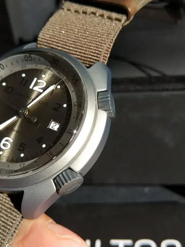 Al tratarse de la línea Pilot, este Hamilton no podía pasar por alto un bisel para cálculos de tiempo. En este caso la firma se decanta por un bisel interno que se maneja desde una corona situada a las 2.
