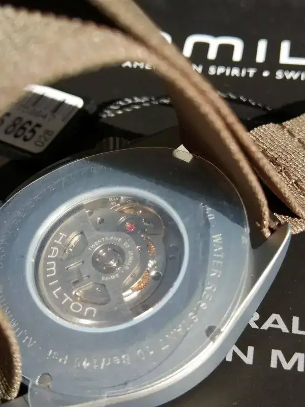 El cristal de zafiro frontal viene tratado con un anti-reflejos muy bueno. En la parte trasera también encontramos zafiro, que permite observar el contrastado movimiento H-10 con hasta 80 horas de reserva de marcha.