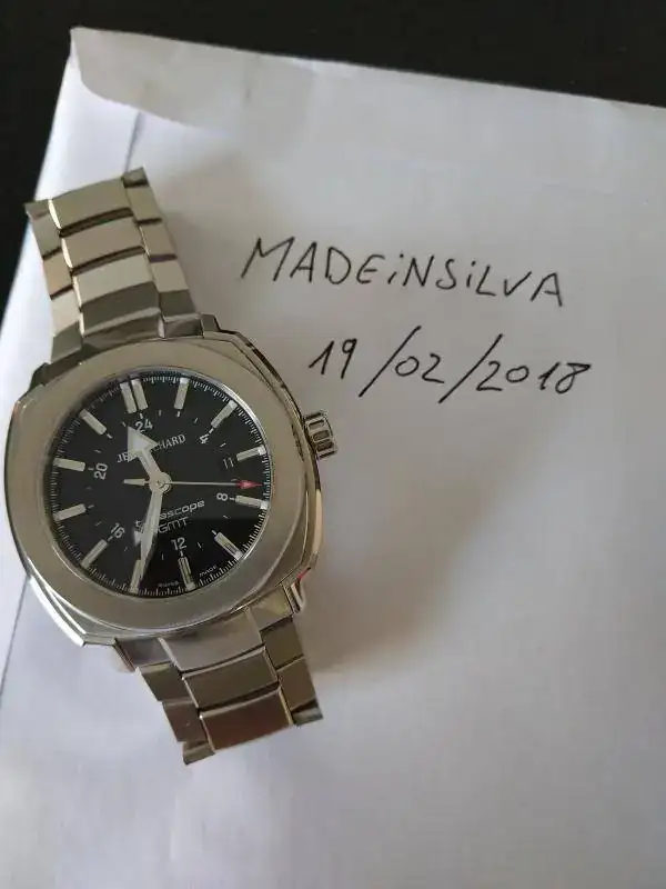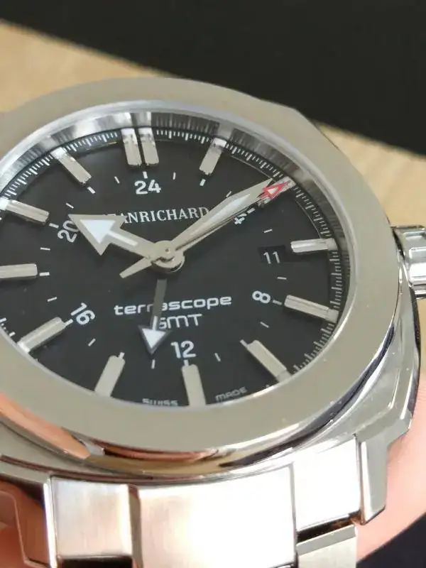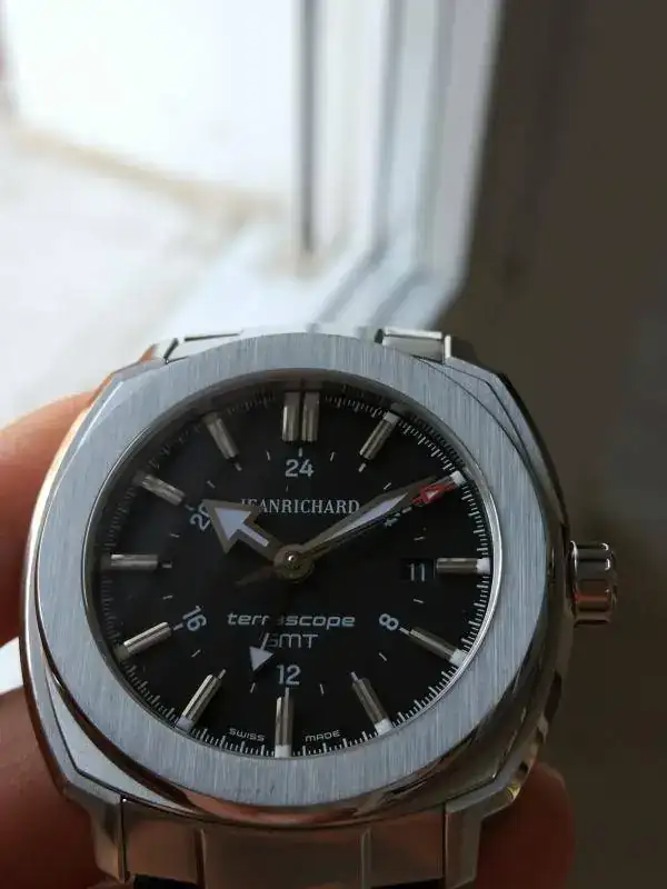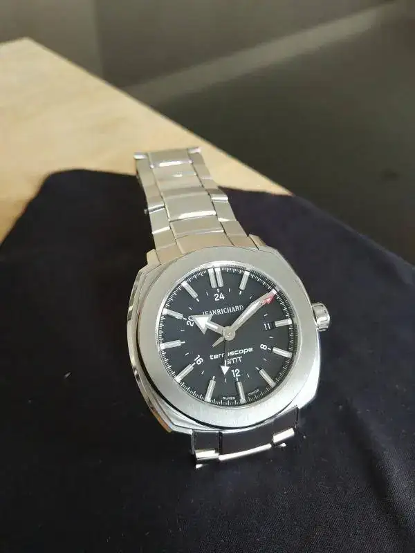 Se trata de un archiconocido JeanRichard modelo Terrascope GMT con dial negro. Es un reloj precioso e increíblemente versátil. Con fechador ubicado a las "3" muy bien integrado al utilizar el mismo color de la esfera y alineado con el uso horario GMT.