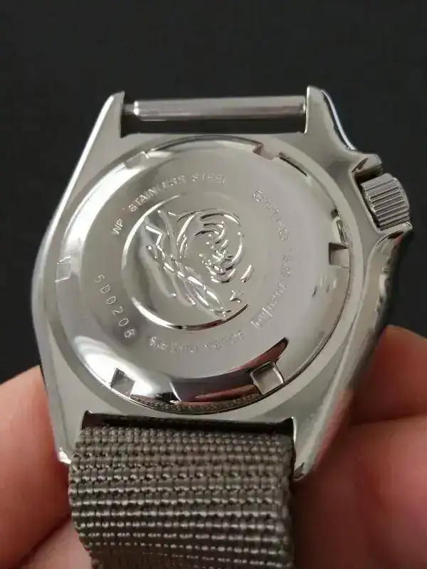 Corona roscada que garantiza hermeticidad hasta los 200 metros y tapa trasera enroscada con el dibujo característico de la ola.