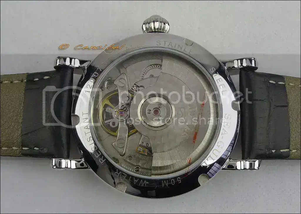 Este reloj cuenta con parte de la maquinaria visible a través de la esfera, una original característica que tiene es el movimiento