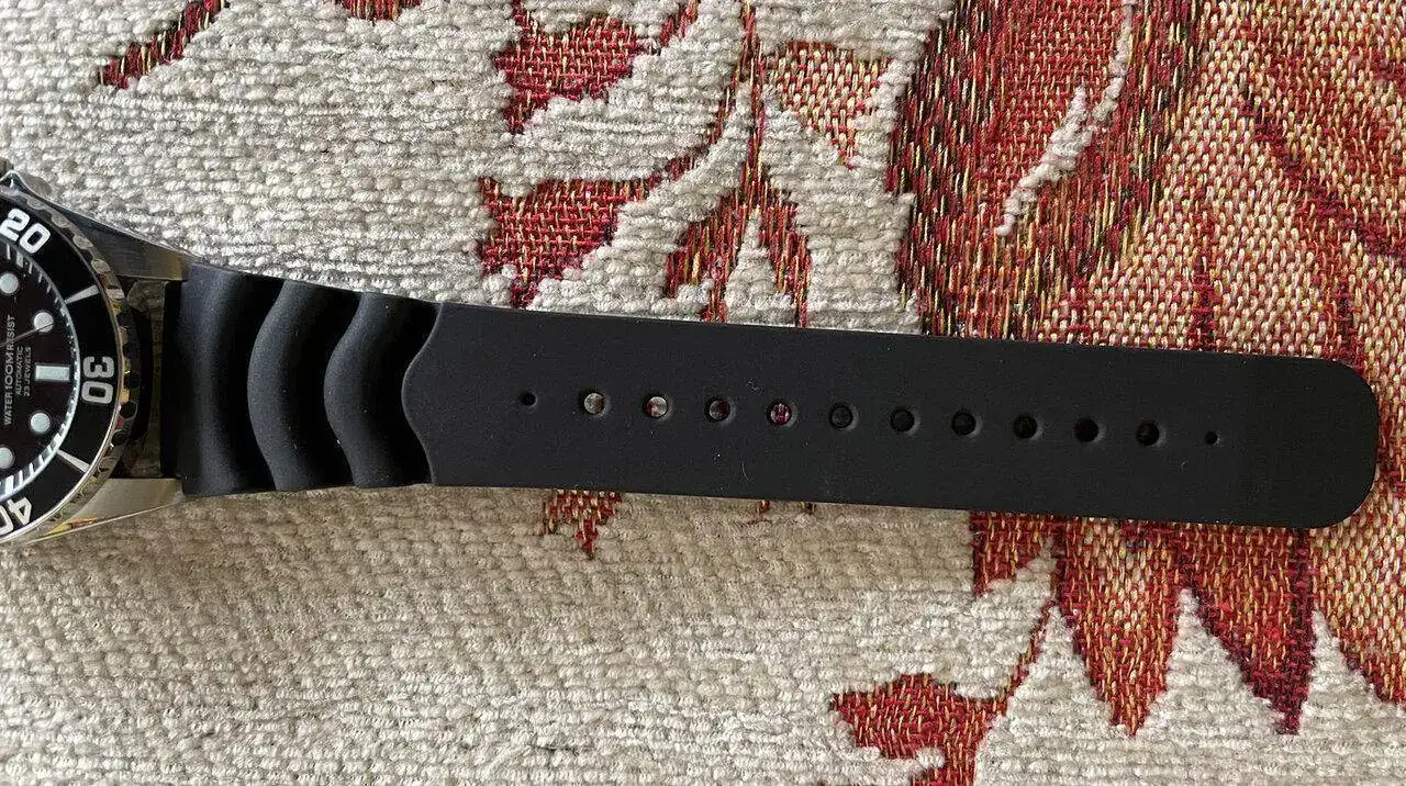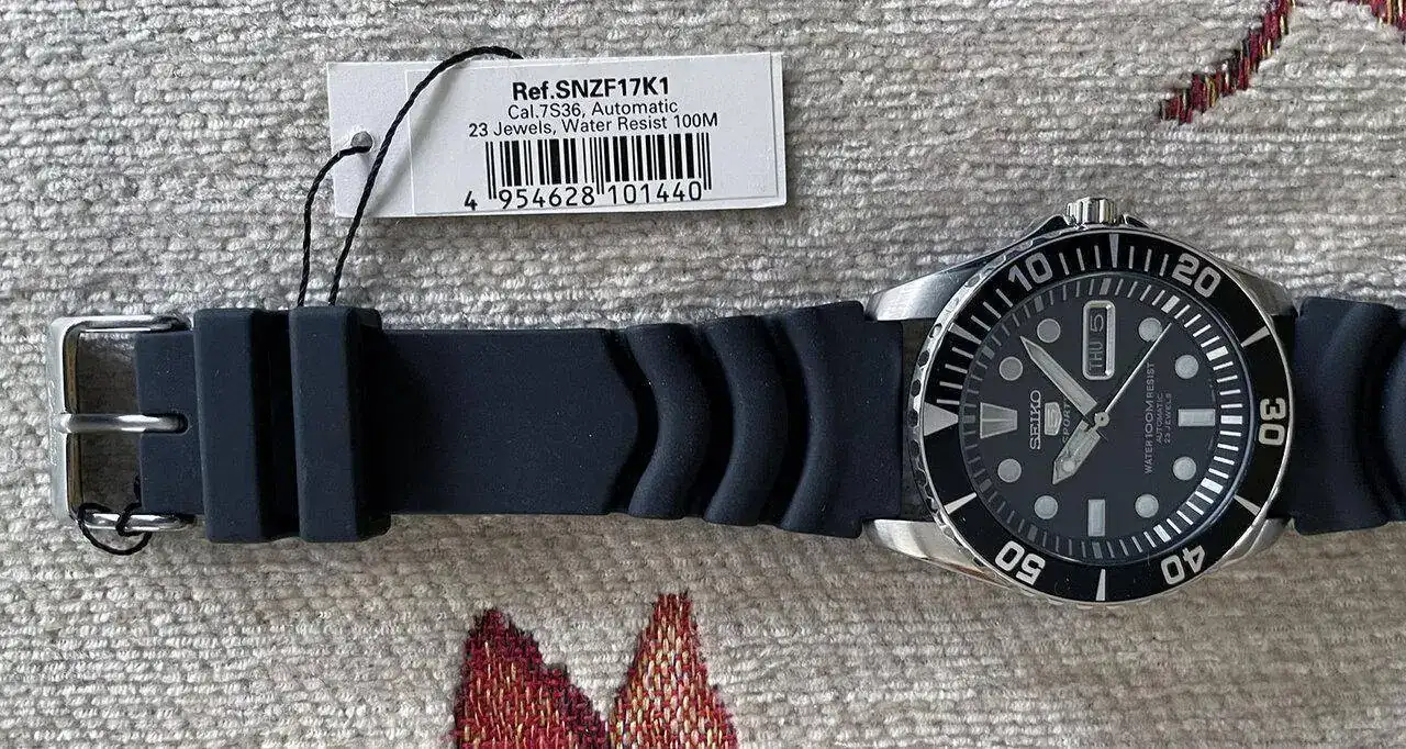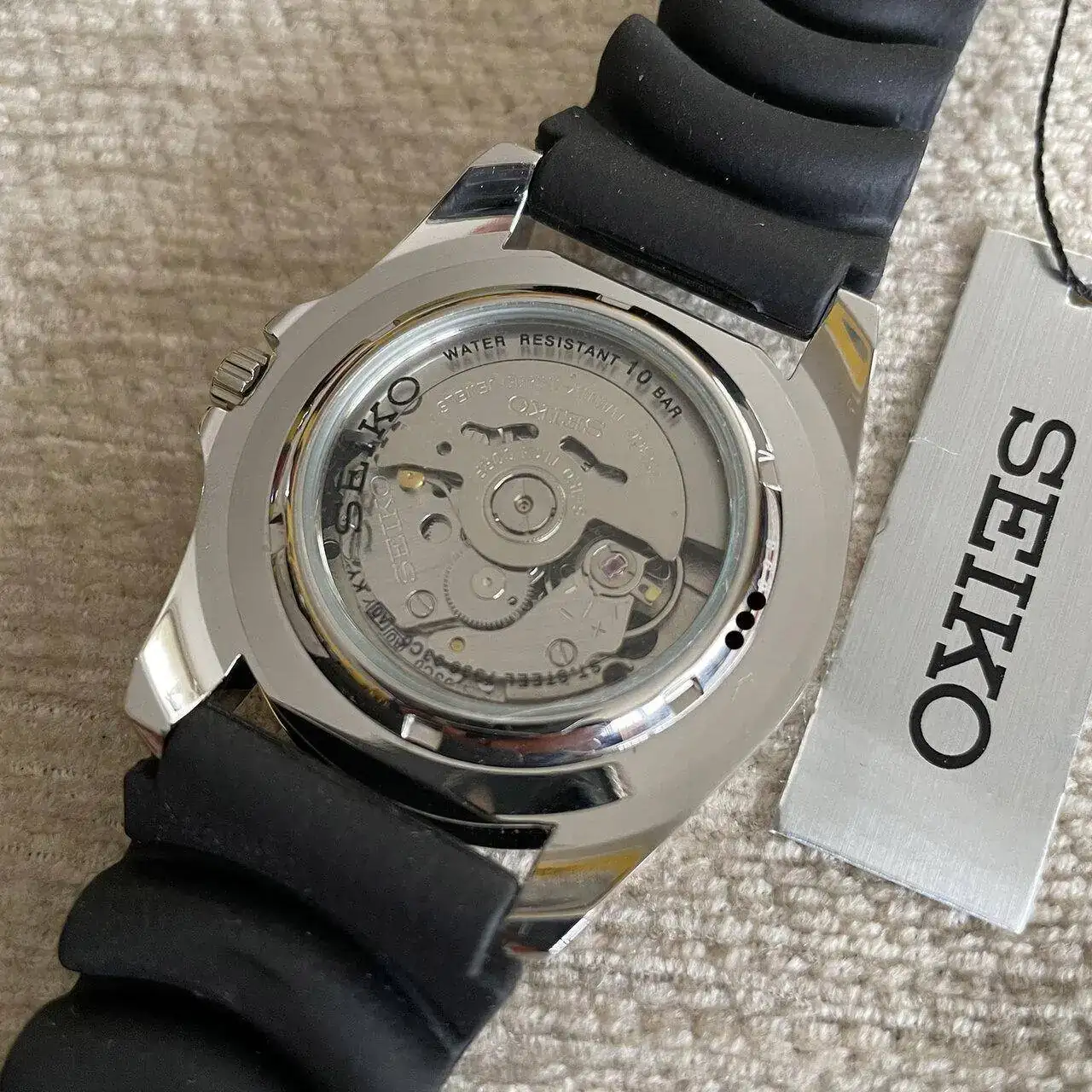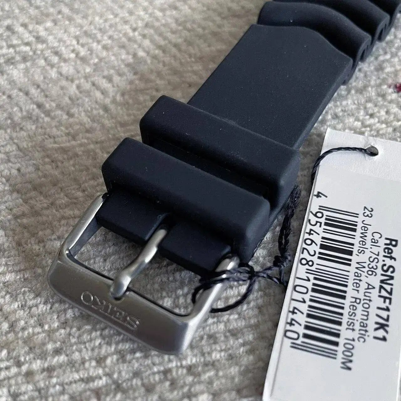 El reloj monta una correa original de resina negra Seiko Z22 en lugar de brazalete de acero.