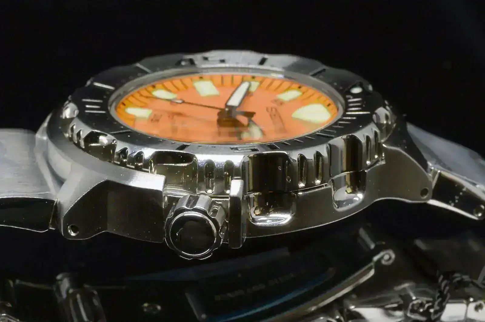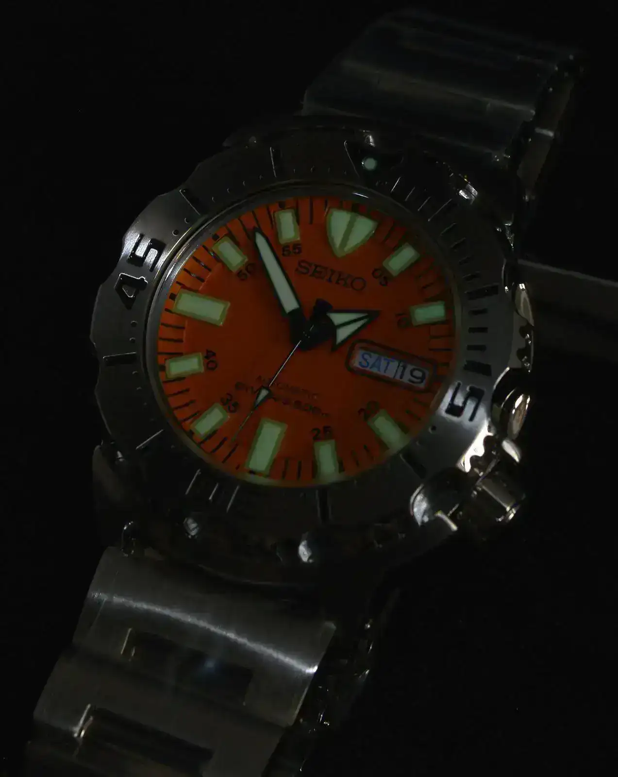 Esfera color naranja, con agujas y marcadores horarios luminiscentes.