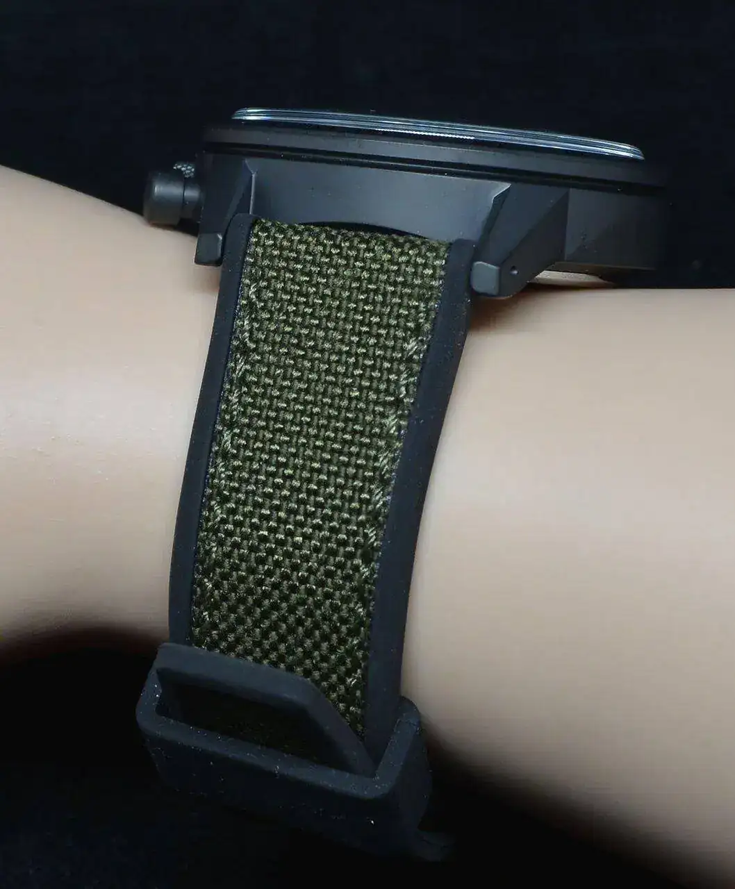 Pulsera: Textil color verde con cierre tipo hebilla en color negro.