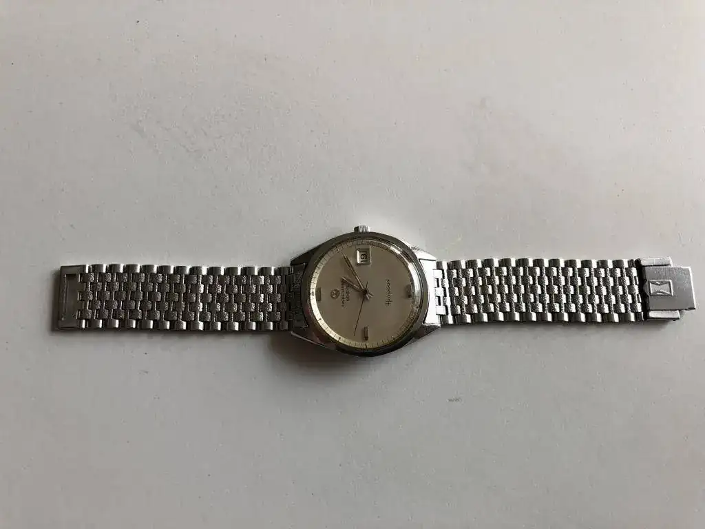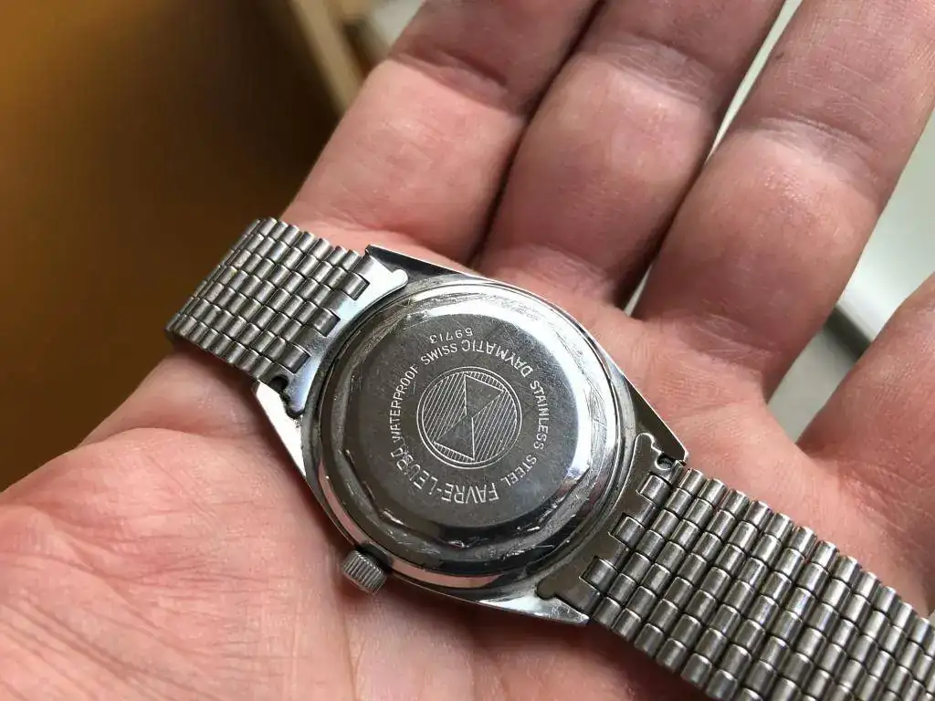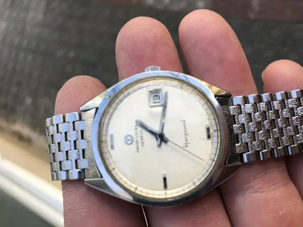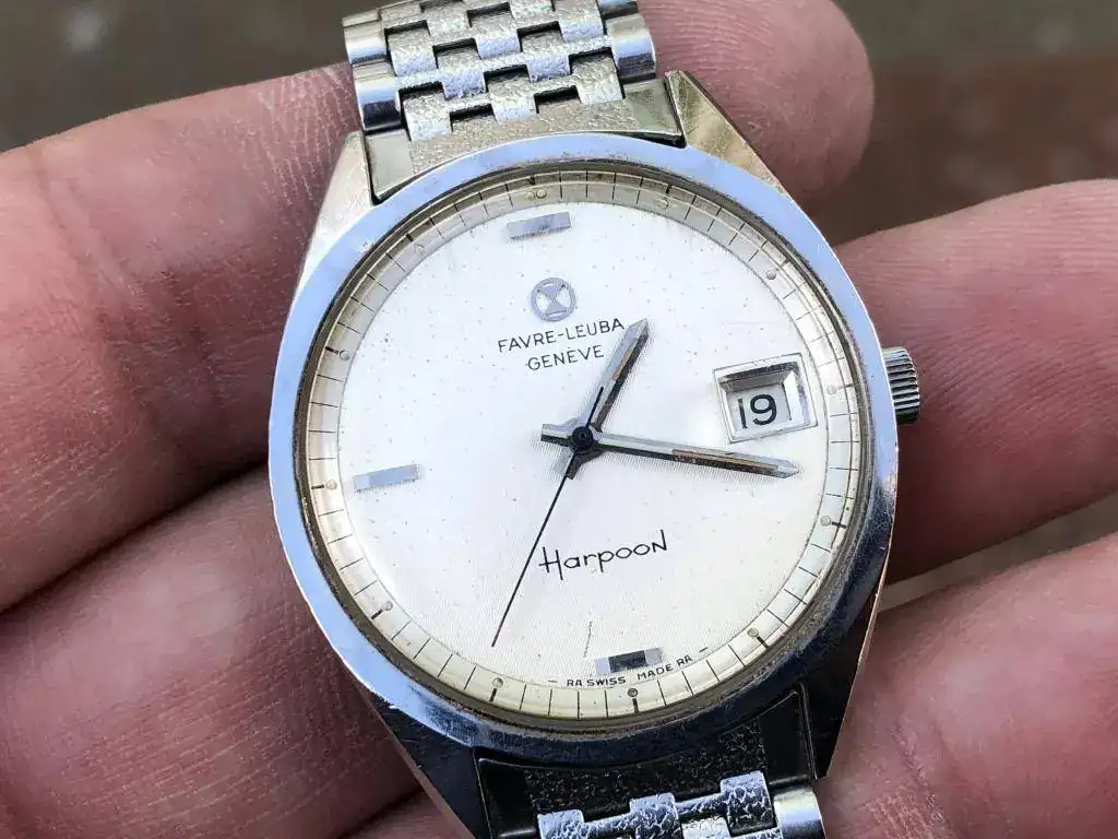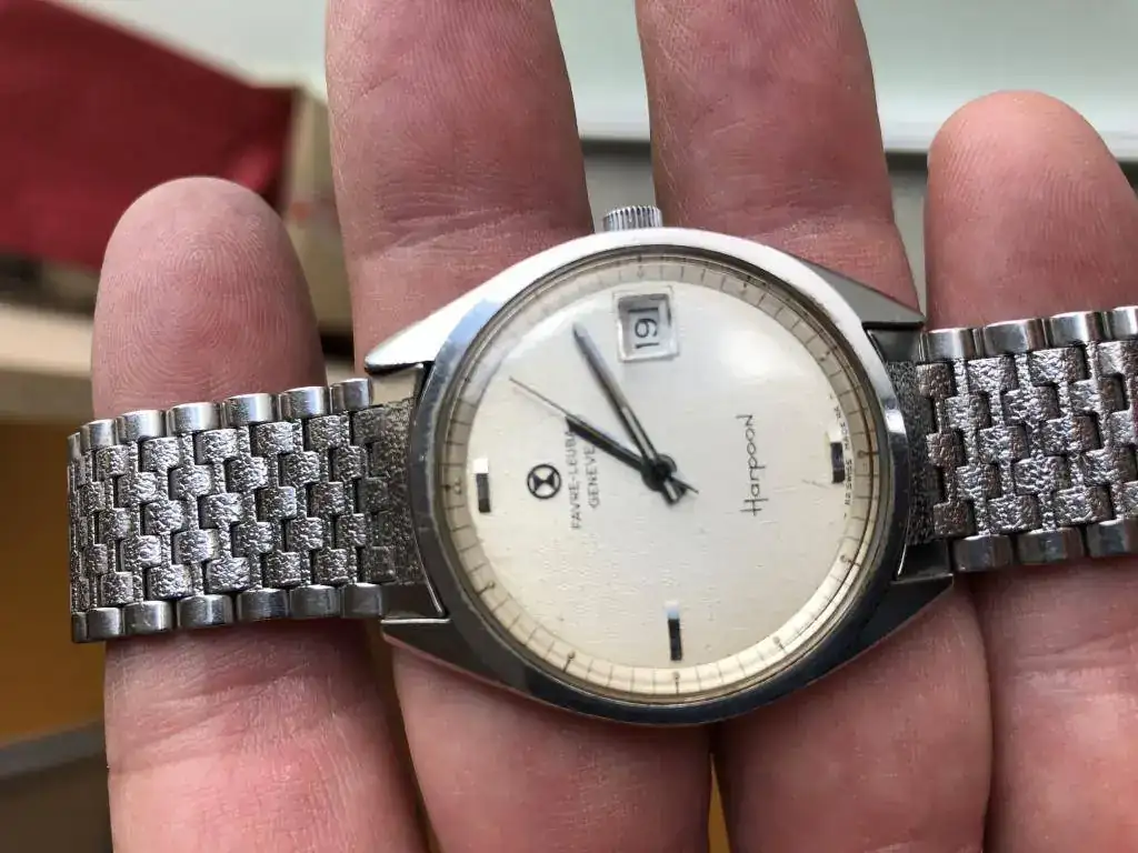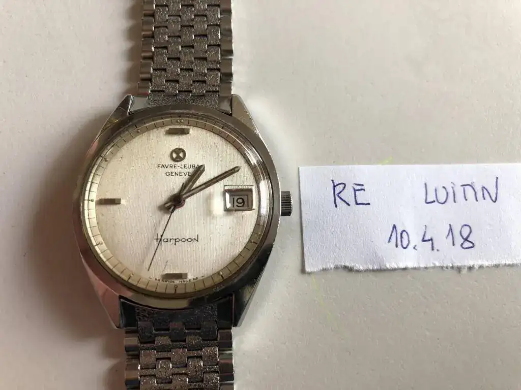 Saco a la venta este Favre Leuba Harpoon, en buen estado y funcionando muy bien aunque por los años que tiene presenta rayaditas en el plexi que es el original y no quiero tocar (pero con un leve pulidito queda perfecto) y marcas del paso de los años (ver fotos). A resaltar que todo es original, esfera, plexi, corona roscada con el logo, armis original para muñecas de hasta unos 17,5- 18 maximo