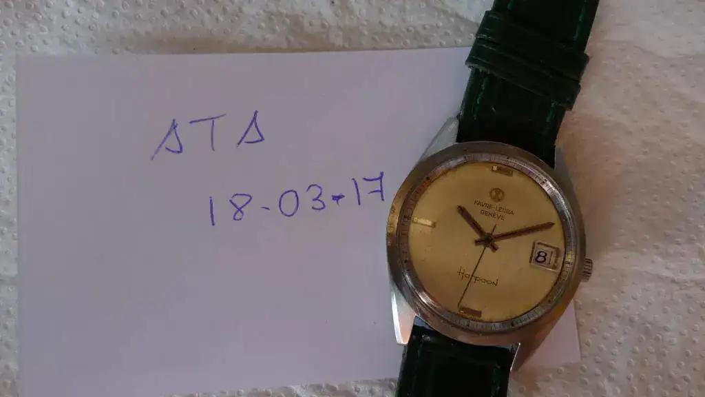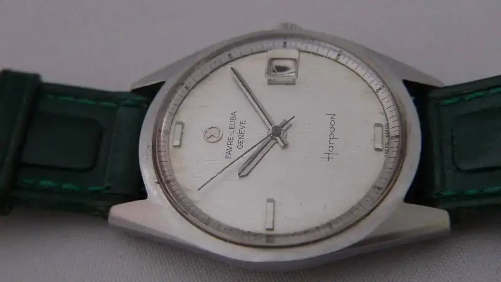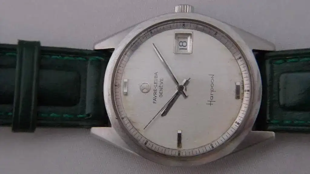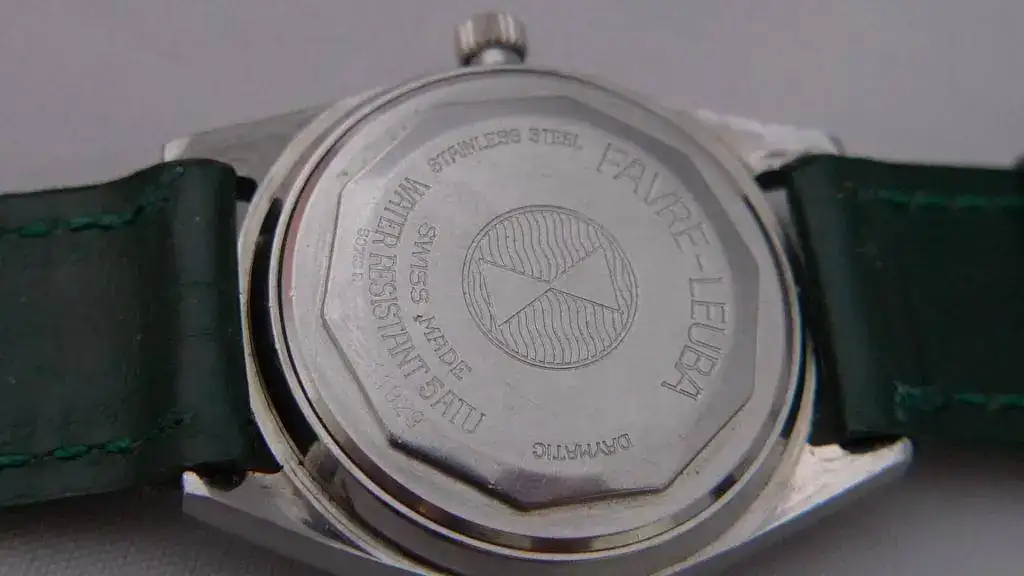 Se trata como véis en las fotos del archi conocido Fave-Leuba modelo Harpoon, la gama resistente al agua de esta famosa marca. La caja es de acero con fondo a rosca de 35mm sin contar la corona. El fondo viene con el anagrama de la marca y como se puede ver es a rosca y la corona, difícil de encontrar es la original firmada.