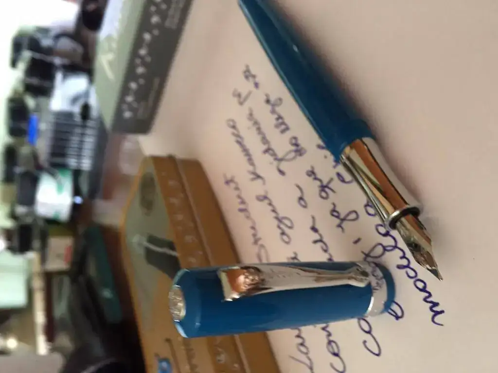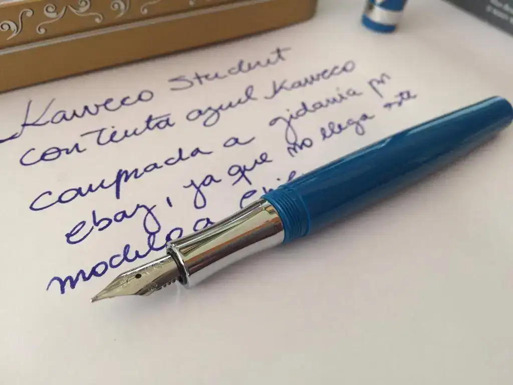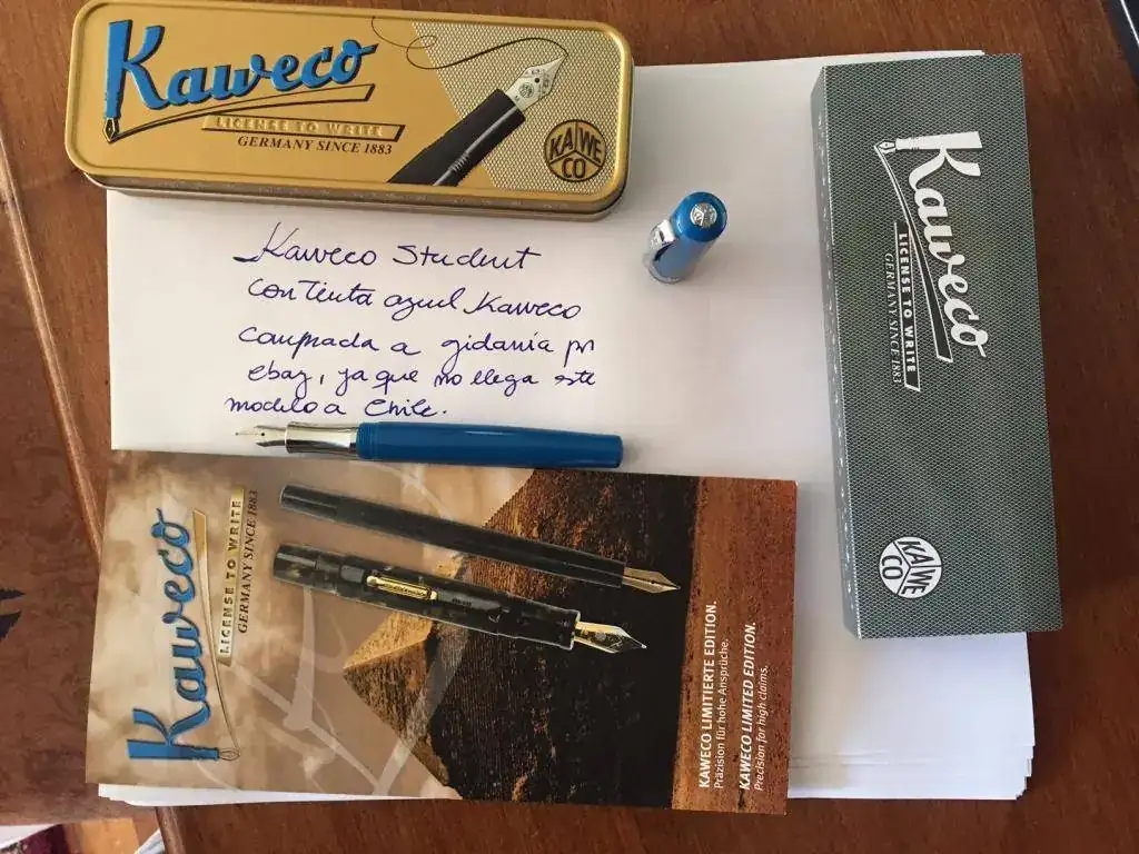 Hola, escribo para compartir con ustedes mi última adquisición. Una Kaweco Student, plumin M, en tono azul retro. En Chile no llegan estas estilográficas, y después de leer en este foro buenos comentarios sobre la marca me animé y compré una por ebay. Demoró poco más de un mes en llegar pero creo que valió la pena. Es muy cómoda, muy suave de escribir y de verdad estoy muy contento, puesto que para ser una lapicera económica, creo que además trae una excelente presentación en caja metálica.