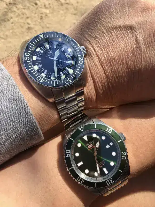 En la playa con mi hijo Gerard y mi Seiko ‘robado’.