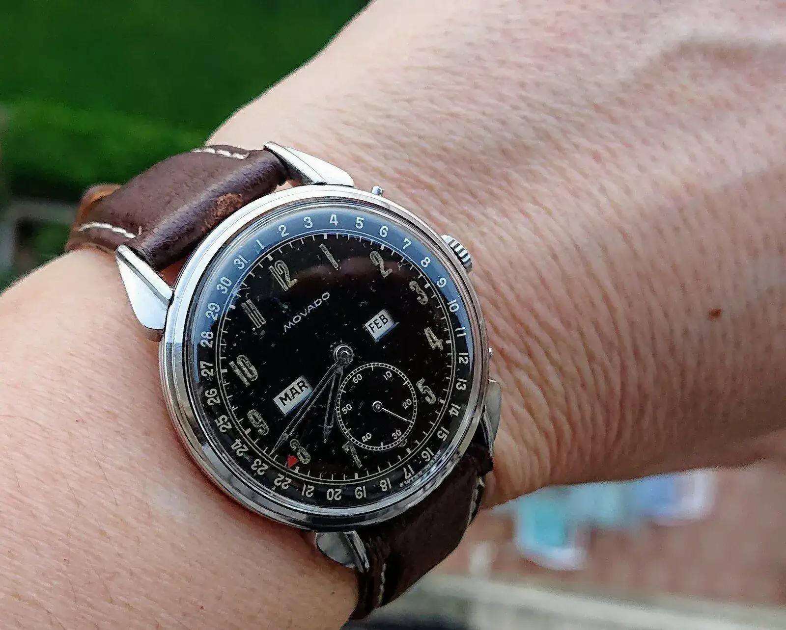 Gracias Jose: es un Laco, alemán, una de las cinco marcas -junto con Stowa, Wempe, IWC y A. Lange & Sohne-, que dotó con sus flieger a la Luftwaffe el siglo pasado.Desconozco la marca, pero el reloj es muy guapo, y sin fecha.