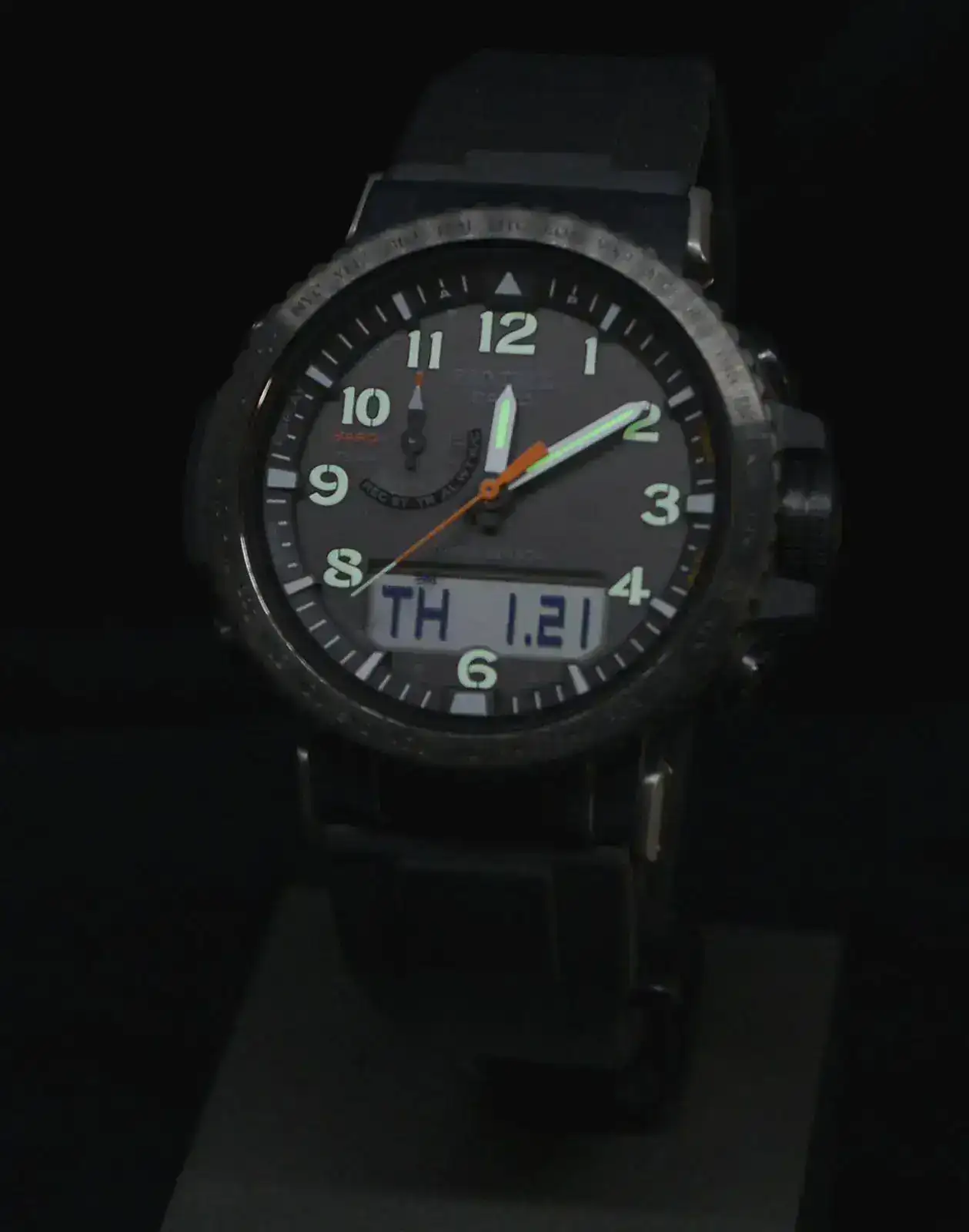 Para garantizar que pueda ver todo, incluso en la oscuridad, la esfera del reloj analógico y la pantalla digital se iluminan con un LED con solo presionar un botón.