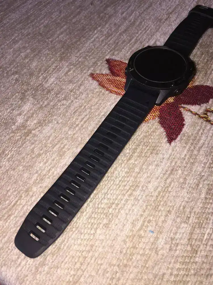 Nuevo reloj Garmin Fénix con correa de caucho negra. Está formado por una carcasa de medidas 47 x 47 x 14,70 mm, hecha en polímero reforzado con fibra con cubierta posterior de metal. Su pantalla es transflectiva de 1,30" ( 33,02 mm) de diámetro, con una resolución de 260 x 260 píxeles, y cumple con el estándar militar estadounidense. Su bisel es de acero y cristal de Corning[SUP]®[/SUP] Gorilla[SUP]®[/SUP] Glass 3.