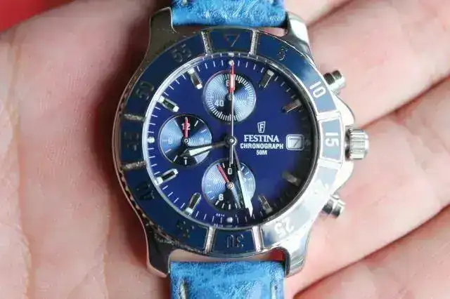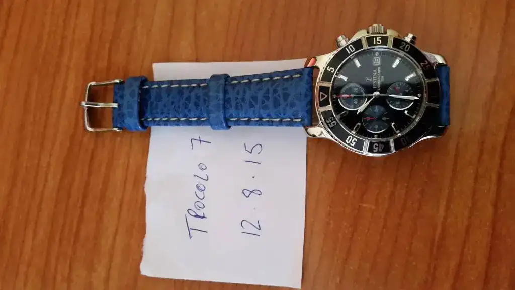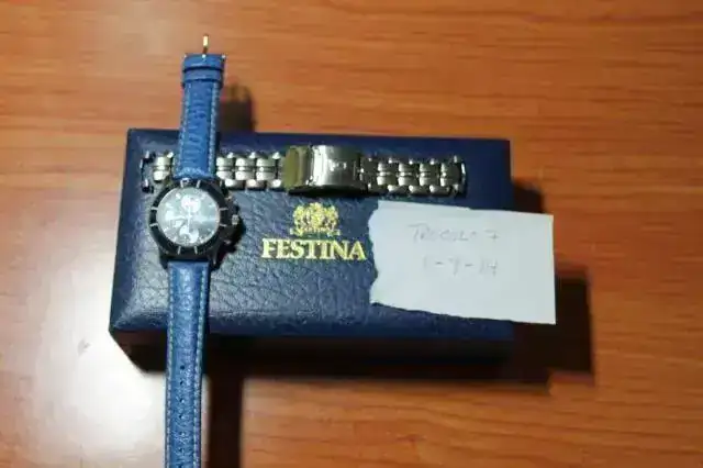 Hola a todos. Vendo este Festina Crono de cuarzo de reestreno total. Es de 2011 pero lo he puesto una vez nada más. La garantía ya ha caducado, como es normal. Tiene una caja de 40 mm contando la corona. Bisel unidireccional de 60 clics, esfera y subesferas de color azul marino y fecha a las 3. Su funcionamiento es correctísimo y salgo un par de pelillos en el cierre del armis, nada más que reseñar. El reloj no tiene caja, bueno sí, pero está en muy mal estado, así que lo mando en otra bastante apañada para el caso. El reloj va con su correa original de color azul, sin estrenar y su armis también original. El precio que pongo es de 58 euros todo incluido. No quiero cambios.