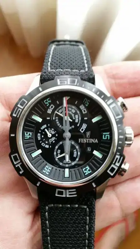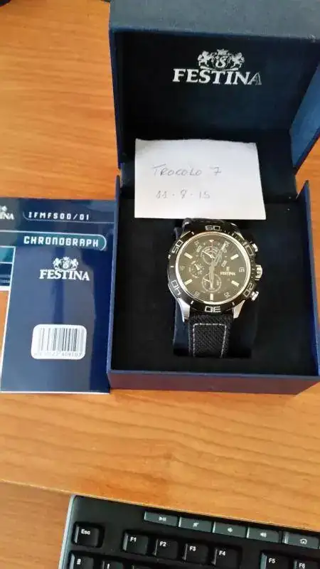 Hola a todos. Vendo mi Festina comprado el 28/3/2014 puesto muy pocas veces. Está casi de reestreno. No tiene marcas ni pelos, pero se nota el uso en la correa, aunque todavía le queda bastante vida por delante. Yo le calculo que está en un 80%. Su funcionamiento es perfecto. Viene con la garantía hasta marzo de 2016, documentación y su caja correspondiente. No quiero cambios.