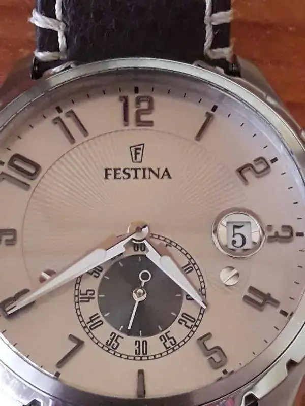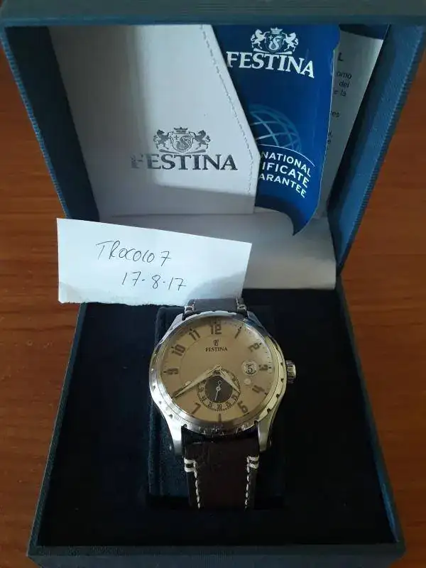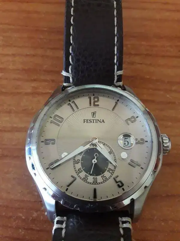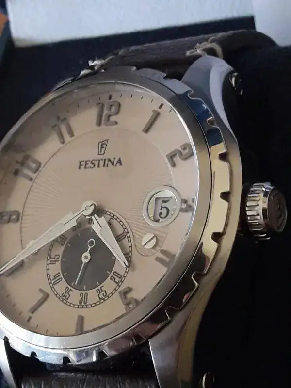 Buenos días. Vendo Festina de vestir en muy buen estado. Algunos pelillos insignificantes en las partes pulidas y por lo demás en perfecto estado estético y de marcha. La correa no es la suya pero es de piel gruesa con pespunte blanco y está de reeestreno. Pido por el 45 euros con envío por correo certificado incluido.