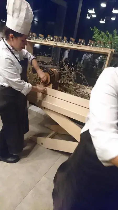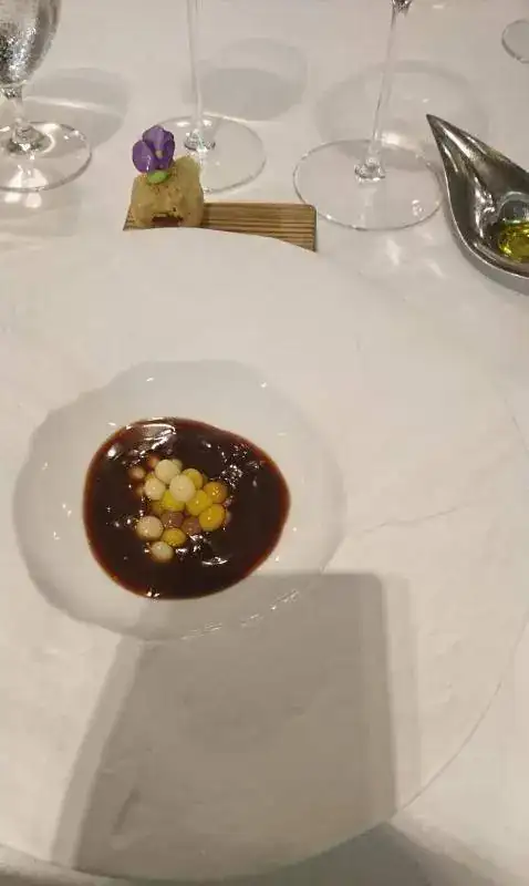 Seguidamente nos acompañaron a la cocina, donde un ejército de cocineros (creo que conté 45) saluda al unísono y pasan a ofrecernos la segunda parte de los aperitivos: un chupito de caldo y un huevo trufado marca de la casa, que te preparan sobre la marcha extrayendo parte de la yema para después inyectar caldo de trufa caliente, haciendo que se cocine de dentro afuera