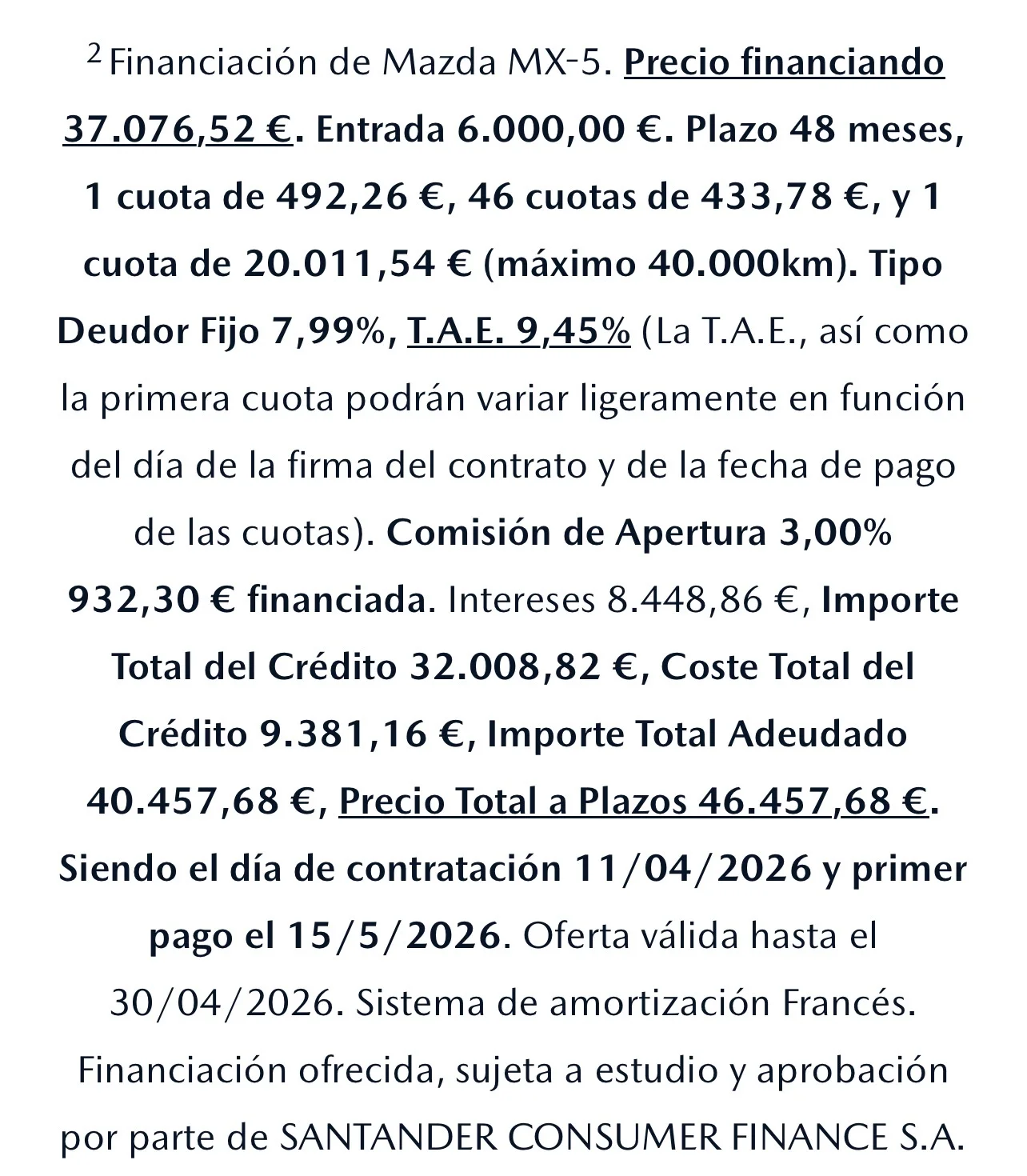 Sale a 550,95 eur al mes. Es otra forma de ver los números. Recordar que el importe de la última cuota es el importe mínimo del vehículo. Se puede vender antes por un precio superior, si el mercado lo acepta. Por ejemplo, en EEUU con los vehículos eléctricos se han encontrado que el valor del vehículo es bastante inferior a la última cuota, con lo que cada coche recuperado, se recupera con pérdidas.Me he metido por curiosidad en la página de Mazda y he seleccionado un mx5: