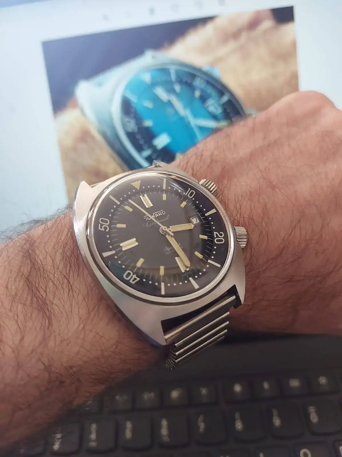 hace unos meses, adquirí un Duward Aquastar continual, con caja supercompresor, que me vino con su brazalete original firmado por Duward. Este brazalete, muy bonito, me quedaba muy holgado en la muñeca, pudiendo llevarlo, pero bailando demasiado aun ajustándolo a tope.