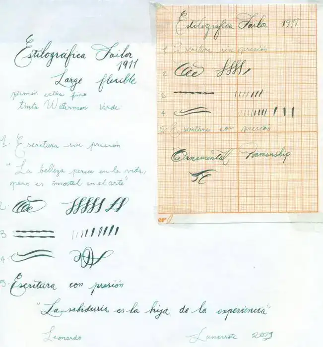 4.- Estilográfica Sailor 1911 Larga con plumín extrafino y flexible de 21kt. A mi parecer no es muy flexible, para lograr la pequeña variacion que se muestra en la fotografia, use damasiada presion. A pesar de ello es muy acorde para uso diario por su suavidad de trazo.