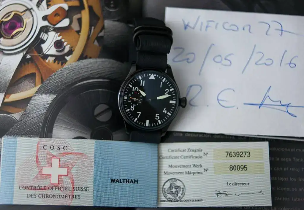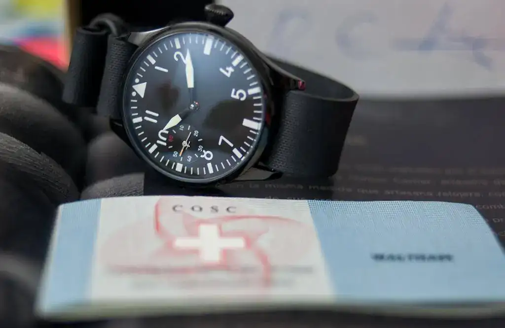Se trata de un reloj flieger con mucha calidad de construcción, el movimiento es COSC y con volante Top de Glucydur.