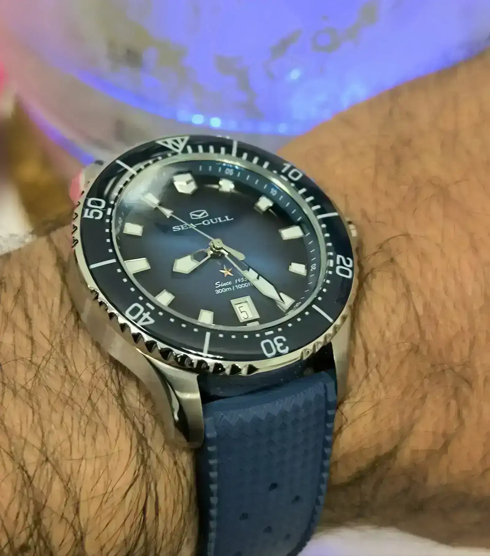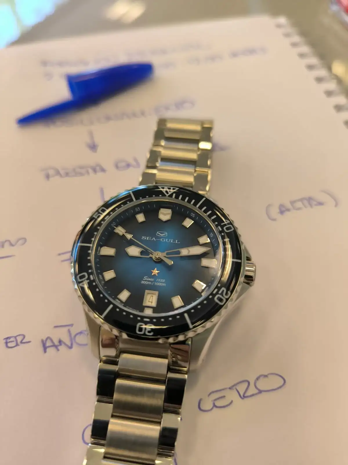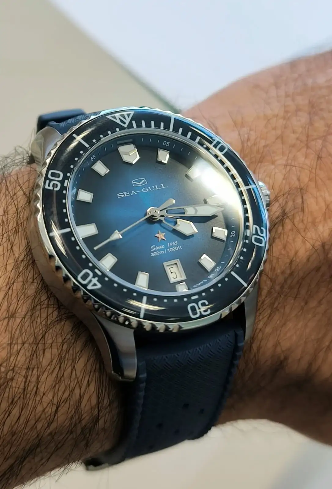 Buenas tardes, pues lo dicho, hoy me ha llegado un Sea-Gull Star 300 metros y os quería contar mis primeras sensaciones, que por cierto, no pueden ser mejores, también mis sensaciones las pongo siempre "en cuarentena" porque soy forero de culo inquieto y mi caja es innegociable de seis. Como soy muy torpe, para no tener que ajustar el armis, lo que si hice fué cambiarlo por una tropic zuludiver azul que le queda estupendamente. Comparto un par de fotos del "bicho" en su caso de 41 de diámetro, hay otra versión más grande, podéis verlo en la foto en mi muñeca de 17 y 50 de lug to lug.
