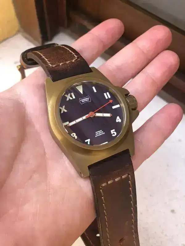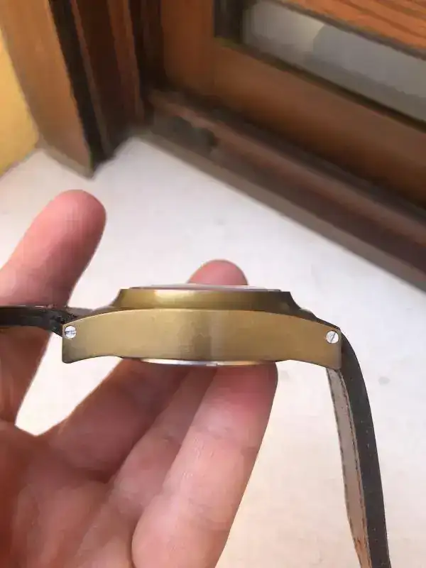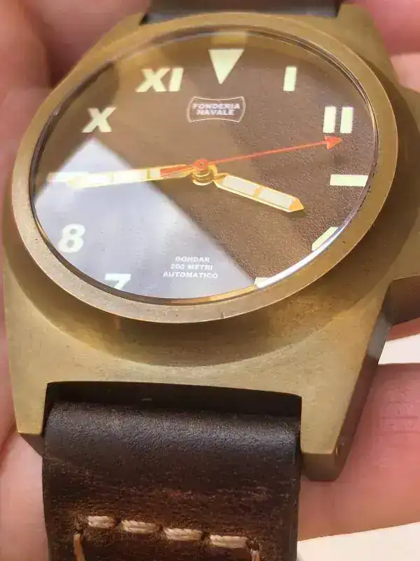 Saco a la venta este reloj que me llegó como parte de un pago, y si bien su diseño es muy muy bonito (u horrible, no deja indiferente), desde que abandoné el mundo Pam, no me veo con este tipo de relojes. El estado es impecable, si bien es cierto que tiene un pelo en el bisel que no soy capaz de fotografiar y mucho menos con la pátina.