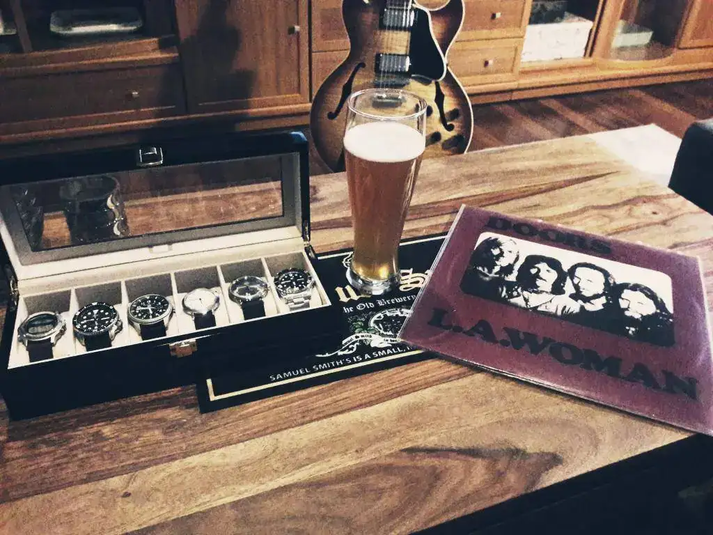 Un buen vinilo, una weissbier, y limpiar los relojes, ponerlos en hora y fecha, elegir las correas que les voy a poner está semana y simplemente mirarlos un rato, escuchando música.