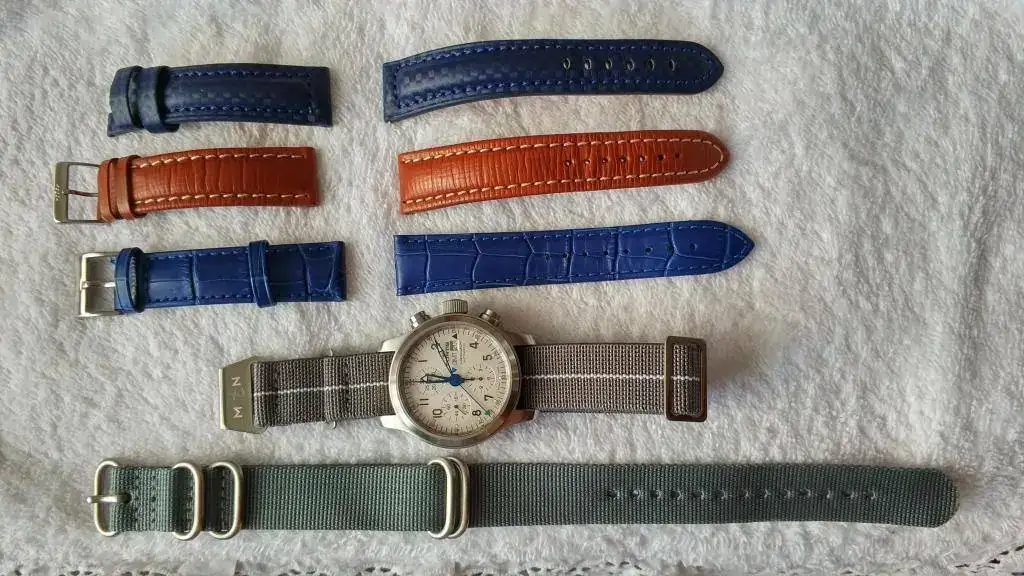 Brazalete😛iel original Fortis marrón, 2 correas azules, una nato gris y una nato de Erika's Mn Strap