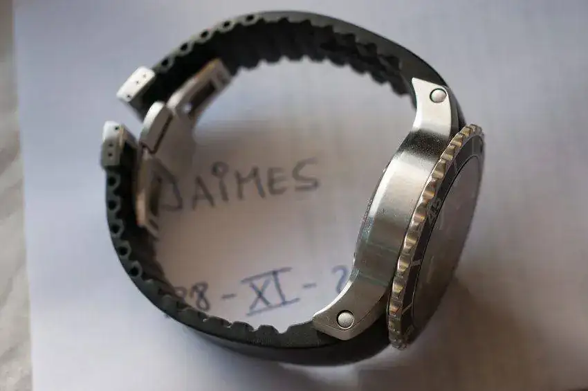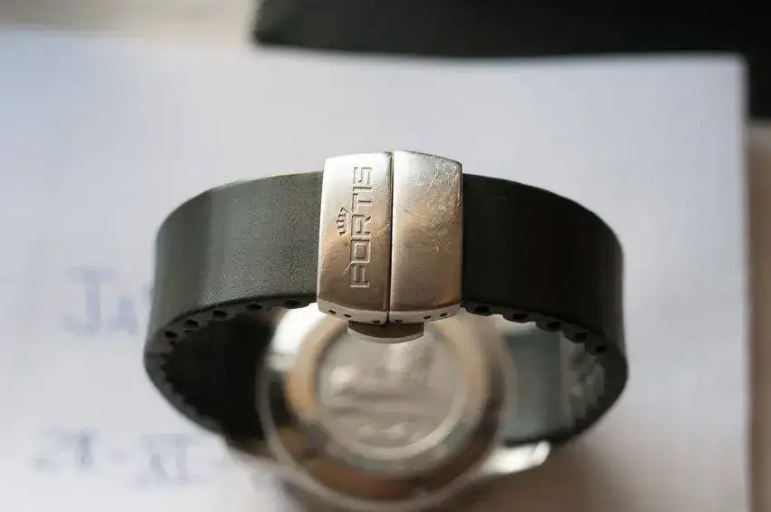 - Brazalete de caucho negro con cierre de acero y logotipo FORTIS. Está cortado para muñeca 18cm.