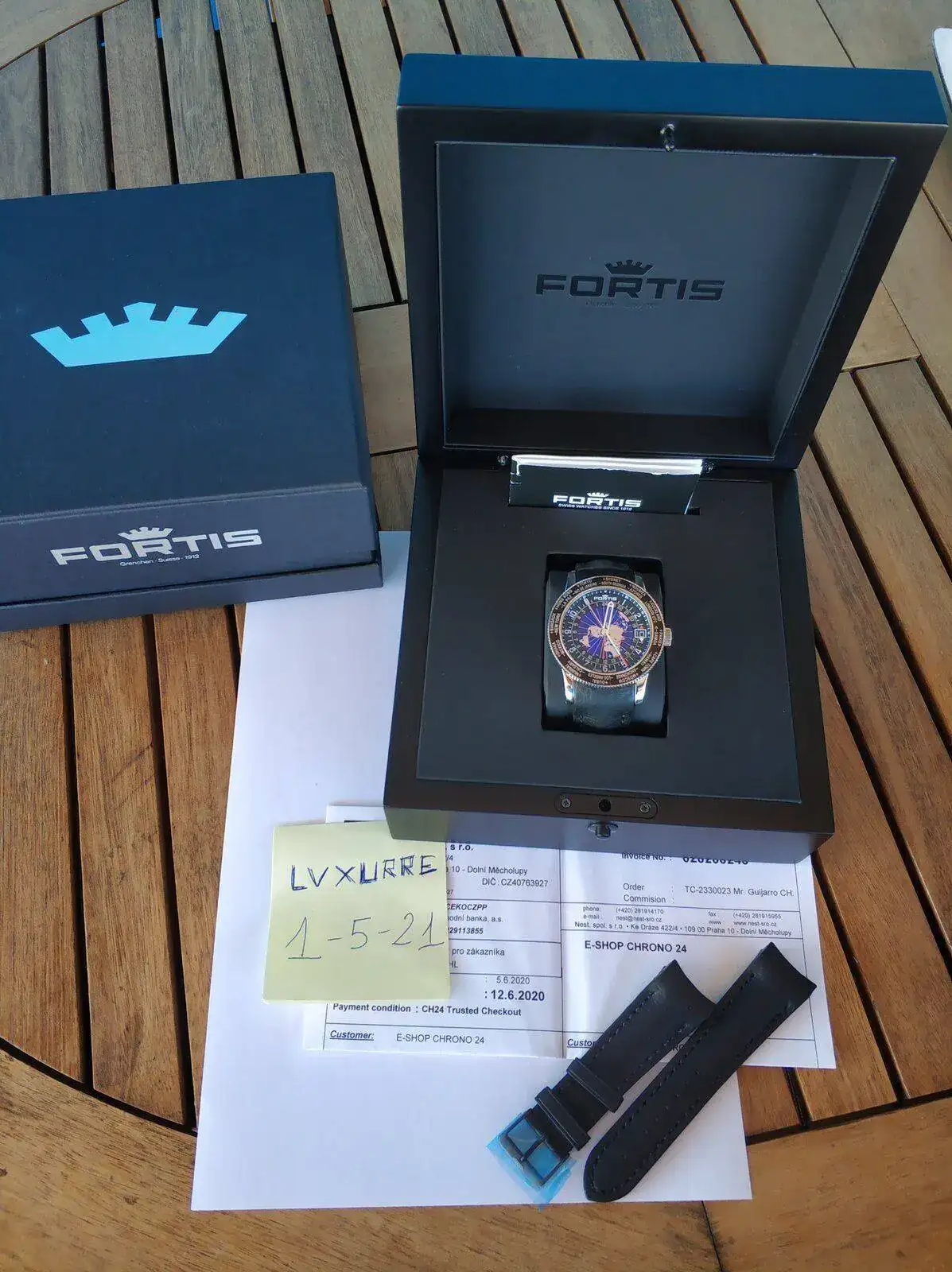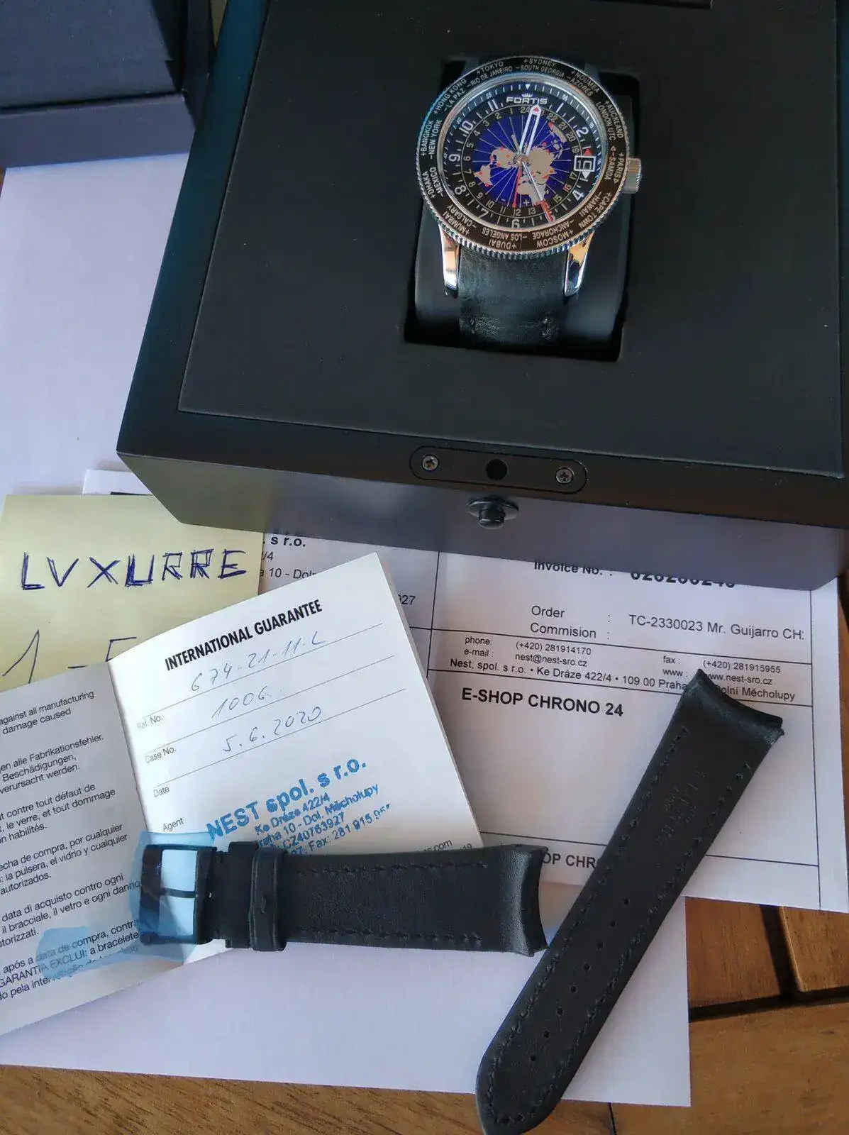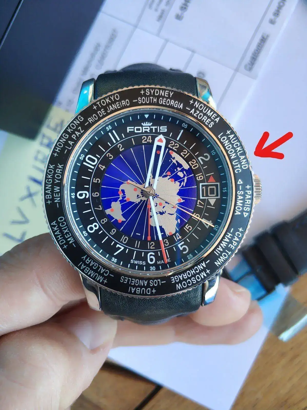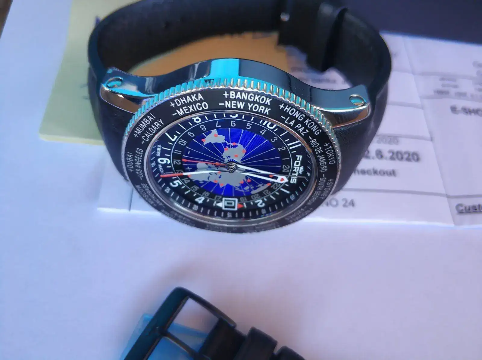 Pongo a la venta este espectacular Fortis GMT, esfera negra. Es una edición limitada a 2012 piezas que consta de un dial que posee un disco giratorio que representa la tierra con indicación GMT con función de 24 h, girando en sentido antihorario como la tierra real. Tiene mecanismo de Big Date propio de FORTIS.