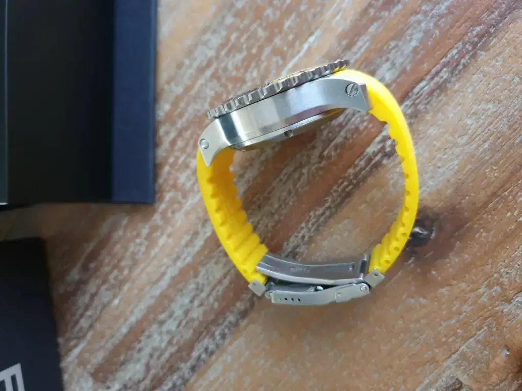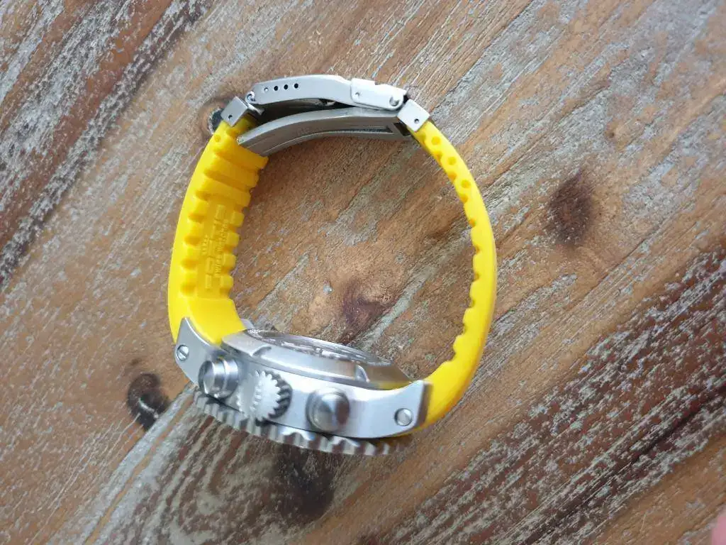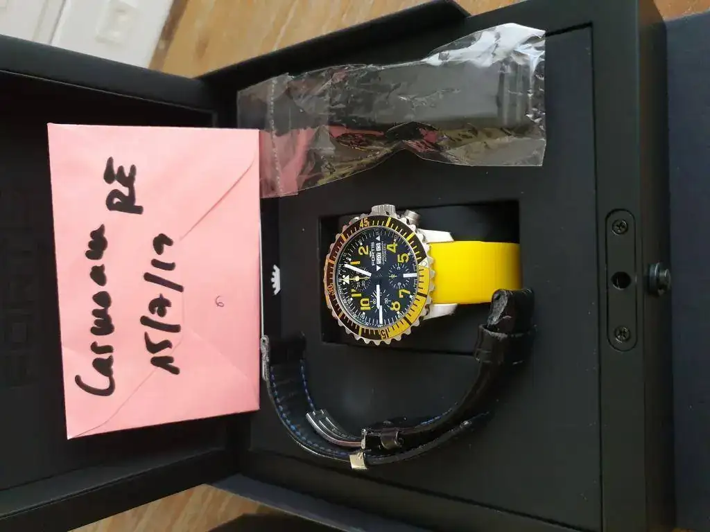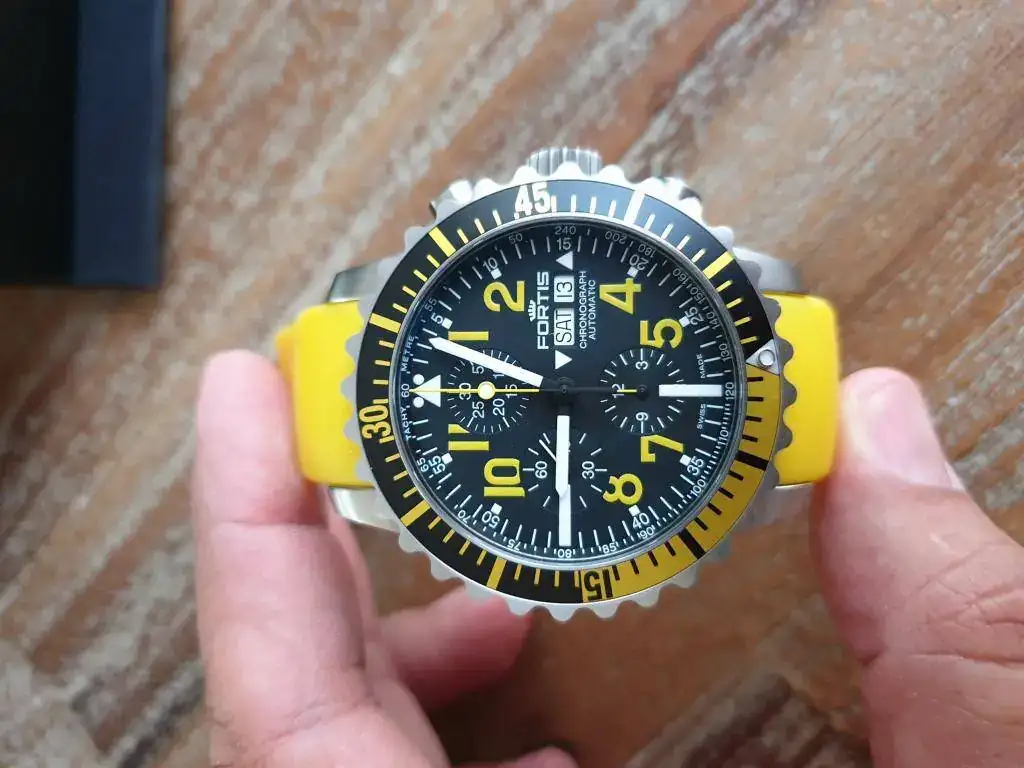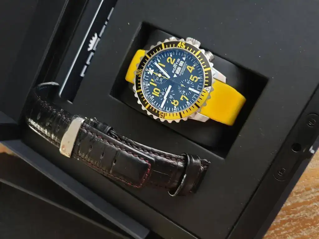 Hoy vendo este reloj de Fortis, con unos acabados impresionantes y muy veraniego con su tono amarillo, incluyo en la venta el caucho original negro para hacerlo más discreto, y una hirsch lord con su deplo que es con lo que me lo he puesto en invierno, aunque esta última correa no forma parte de la venta, es un regalo, está bastante usada.