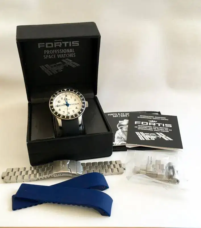 Los únicos cambios con respecto al anuncio anterior es que he cortado la correa de caucho negra para una muñeca de 16,5cm, pero se acompaña de otro caucho original Fortis en azul que compré hace una semana y no he llegado a estrenar. Por lo tanto llevaría el armis completo (que no lo he usado yo y poco el anterior propietario), el deployante del caucho, una correa de caucho negra cortada y una azul sin estrenar. Además de papeles y su caja y estuche.