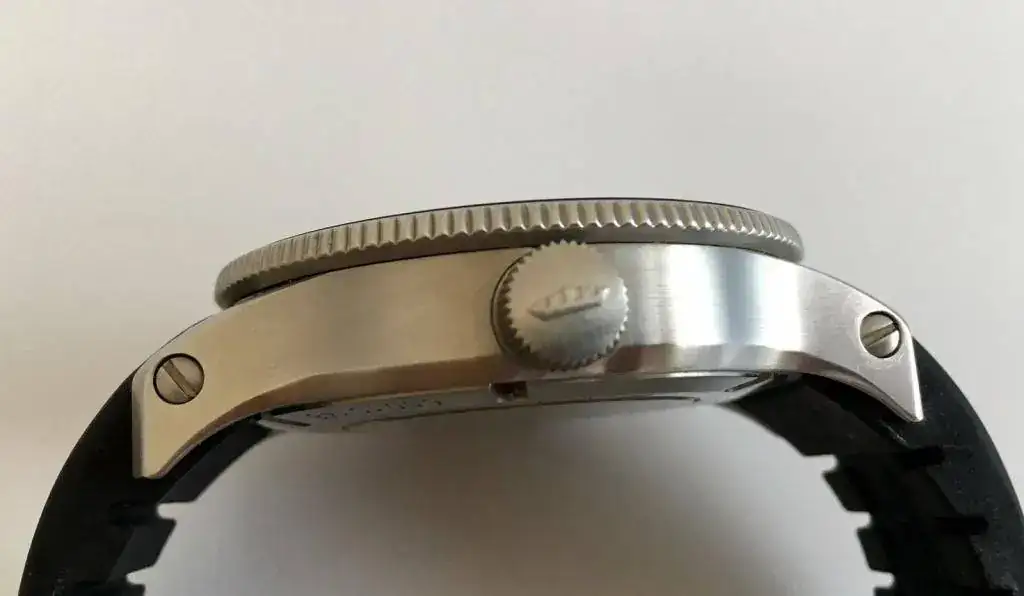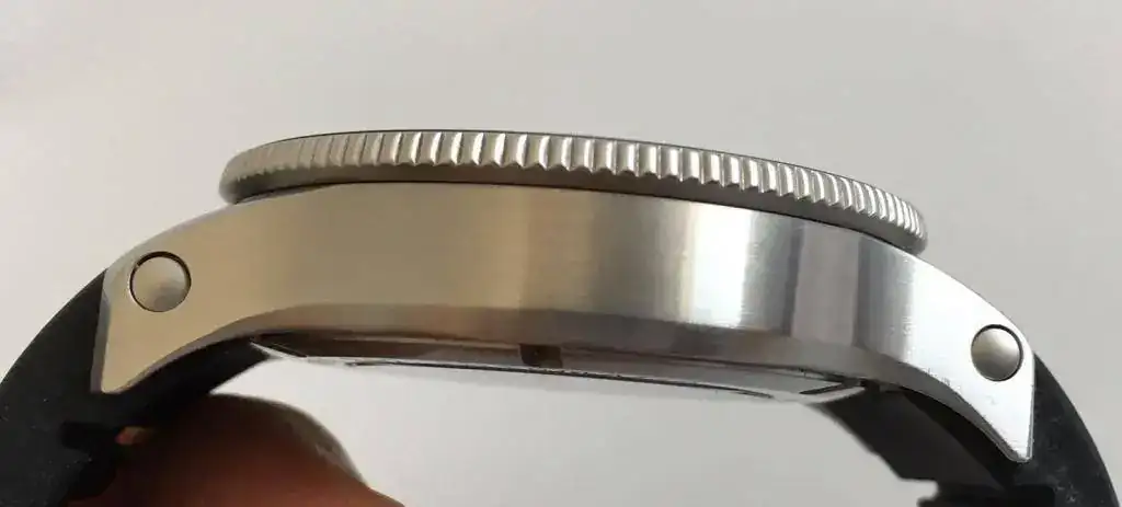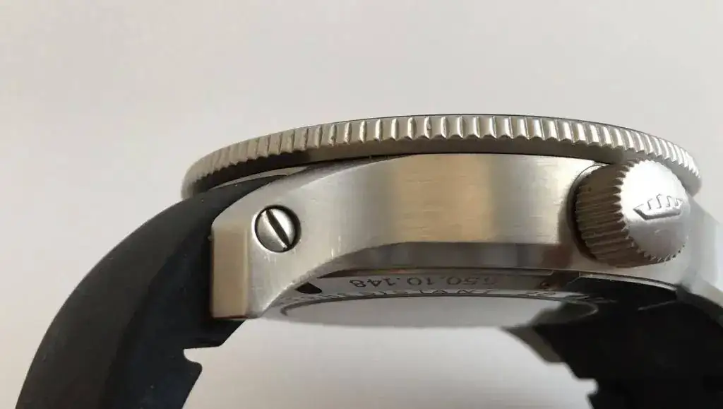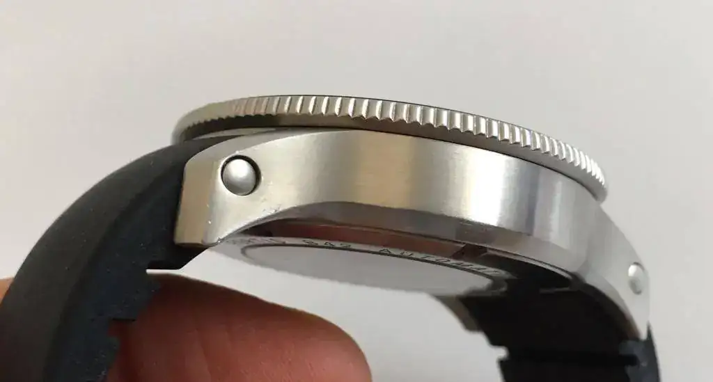 El reloj sigue en las mismas buenas condiciones, pero no está impoluto. En los laterales de la caja hay algunas microrrayas que a veces no sacan bien las fotos, principalmente están próximas a los tornillos de los pasadores. También hay que advertir que en el antirreflejos, cerca de las 2, en muy determinados ángulos, cuando la luz incide de una forma especial, se puede ver una mini rayita de 2 mm de larga que ya la tenía cuando lo compré. En la foto frontal no se ve, por eso he puesto una foto sólo para mostrar esto.