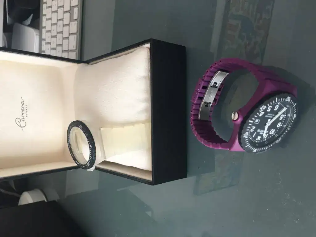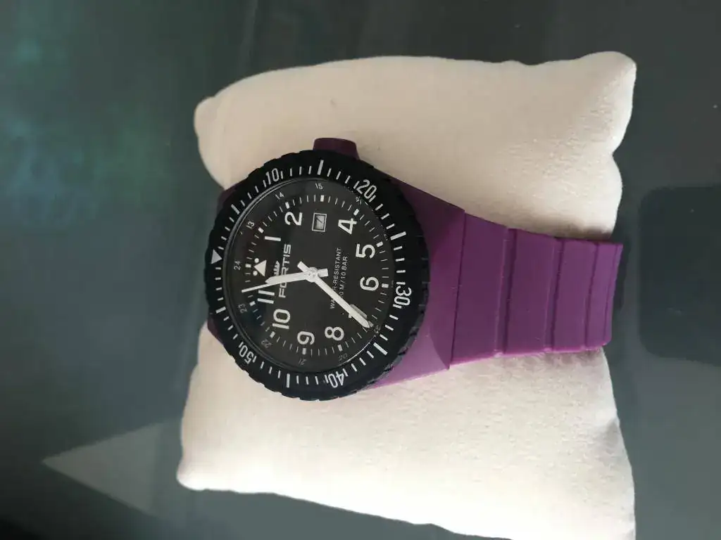 Saludos a los foreros. Siguen saliendo los que no tienen uso, y ahora le toca a este Fortis Colors. El módulo está en un buenísimo estado. Tiene la esfera negra. Acompañan dos correas: una morada a estrenar para muñecas de 19 cm y otra transparente muy trotada y recortada mucho (muñecas muy pequeñas). No tiene caja ni papeles, pero lo acompaño de una caja de cortesía de Carrera.