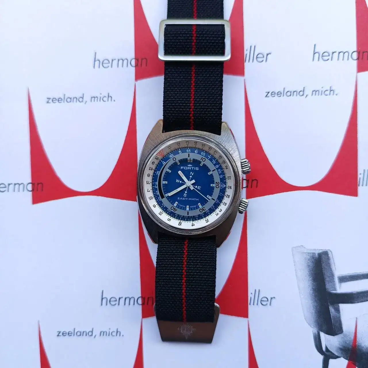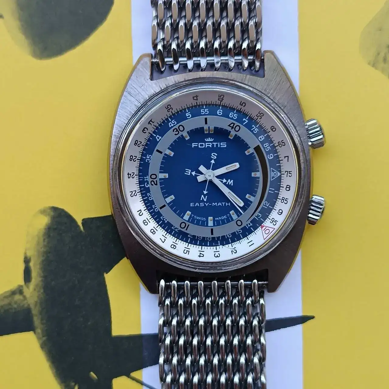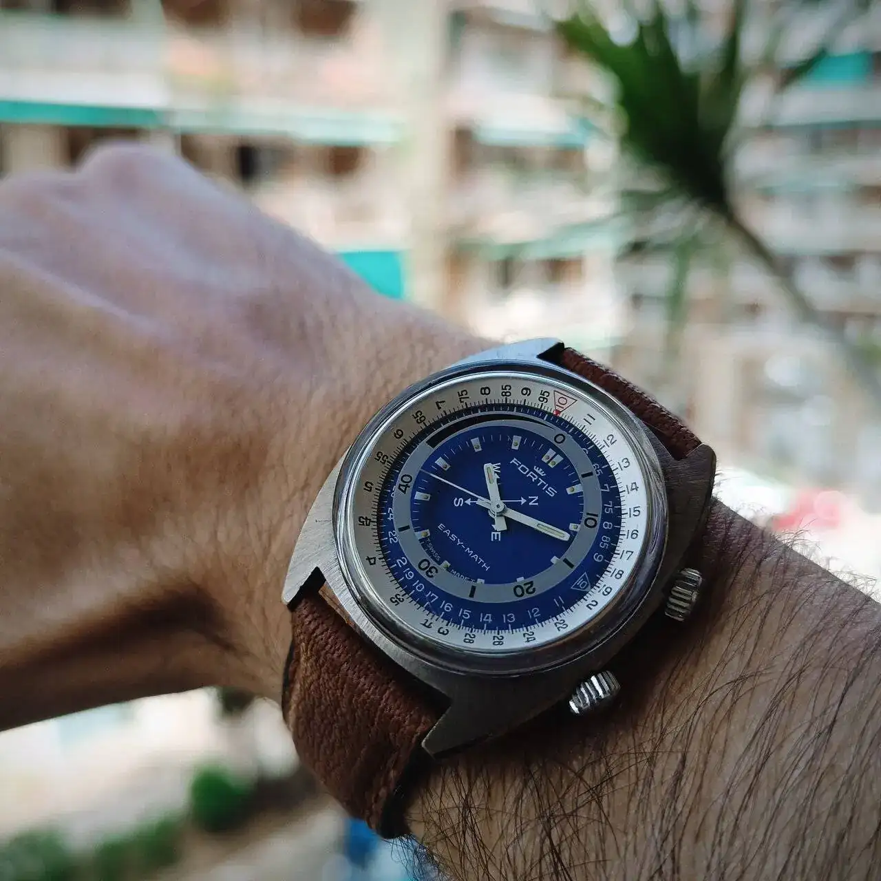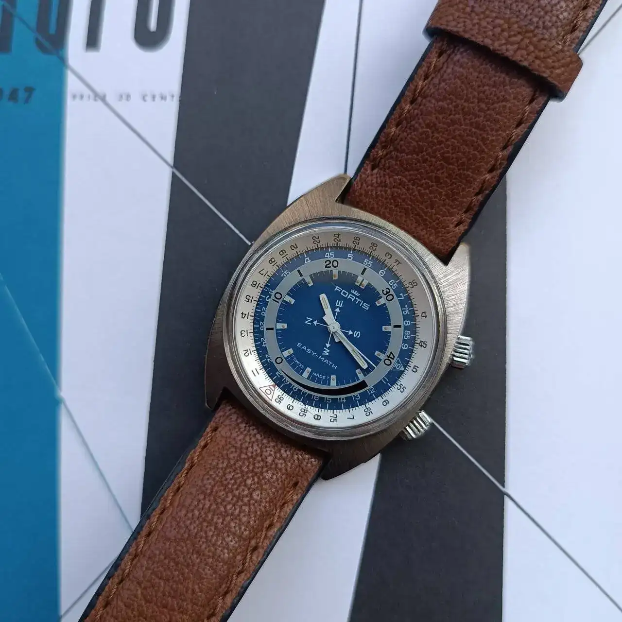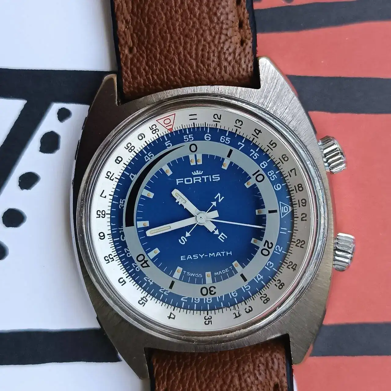 El Fortis Easy-Math tiene una caja cromada en forma de cojín (o "cushion") típicamente setentas, con la parte superior pulida en rallos de sol y los laterales a espejo. Cuenta con dos coronas firmadas con la corona de Fortis, siendo la inferior la que da cuerda al mecanismo manual y cambia la hora, y la superior la que acciona tanto el bisel de cálculo como el disco de los minutos y los puntos cardinales. Tanto la caja cromada como el mecanismo de giro serían los puntos a tener más en cuenta al buscar este modelo, ya que los recambios son inexistentes. Por suerte, en este caso ambos elementos se encuentran en un estado aceptable y el engranaje de la corona superior gira con suavidad. La tapa trasera es roscada, con inscripciones que hacen referencia a la marca y a la patente y la máquina en su interior es una FHF 96 (Standard) también firmada por Fortis, de pocas florituras pero con fama de resistente y que en esta pieza en concreto resulta de un tacto muy agradable a la hora de dar cuerda y mover las agujas.